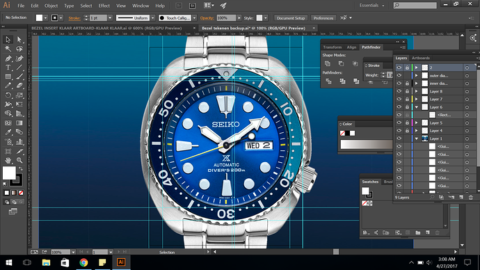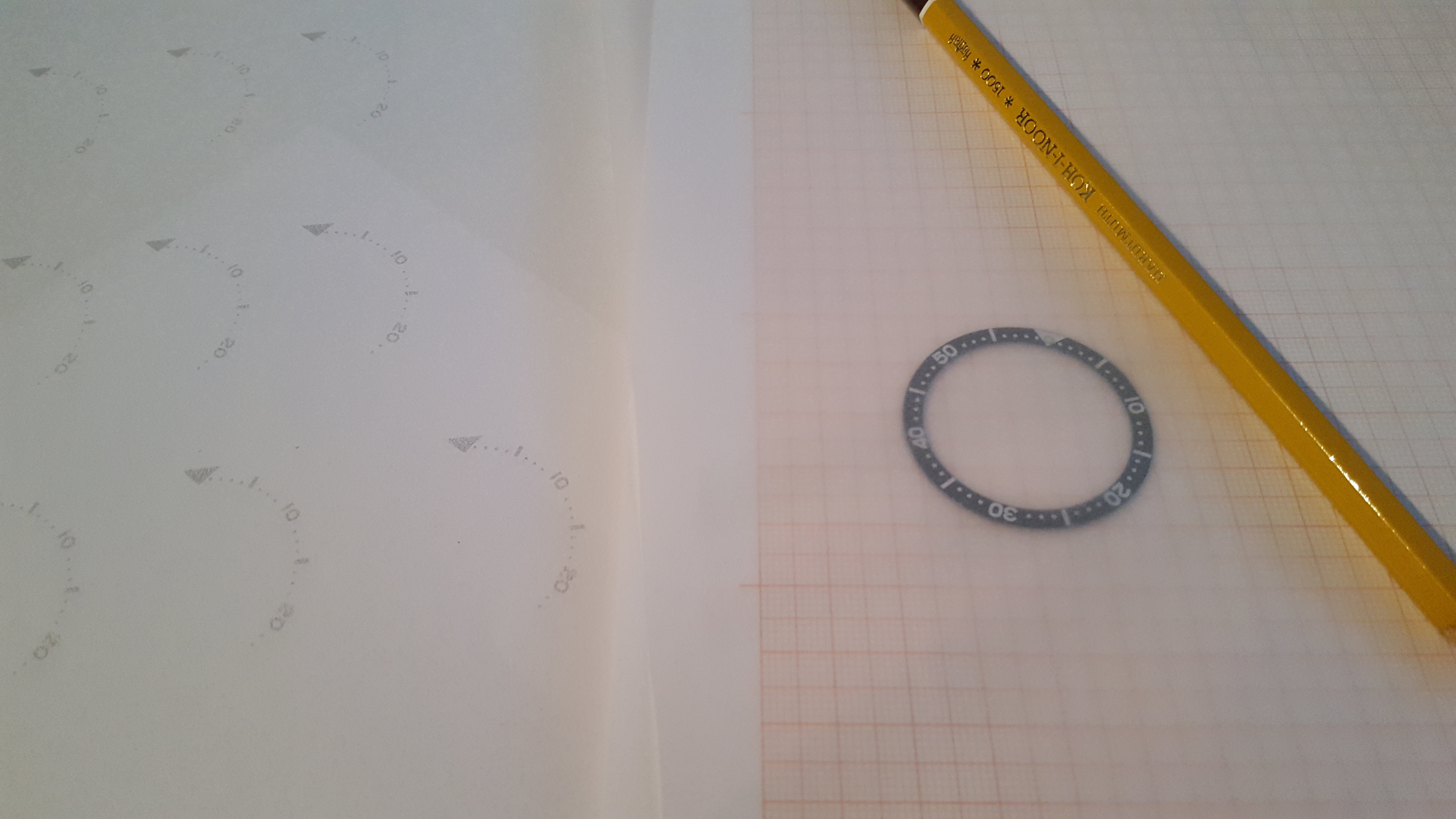 Even goed nagedacht over hoe ik dit aan ging pakken. Het leek mij het makkelijkst om de bezel insert digitaal over te trekken met Illustrator, deze om te zetten naar de SKX binnen- en buiten maten van de insert en te printen op overtrekpapier of strijkpapier.