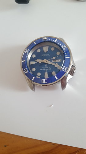 Ik heb een saffierglas gekocht met de standaard dimensies van Crystaltimes, en de orginele wijzerplaat en wijzerset van de SRBP11. Ik had een custom blauwe chapter ring nodig met 4 gele streepjes op de 3,6,9 & 12, een custom bezel insert en done. Project afgerond, another job done