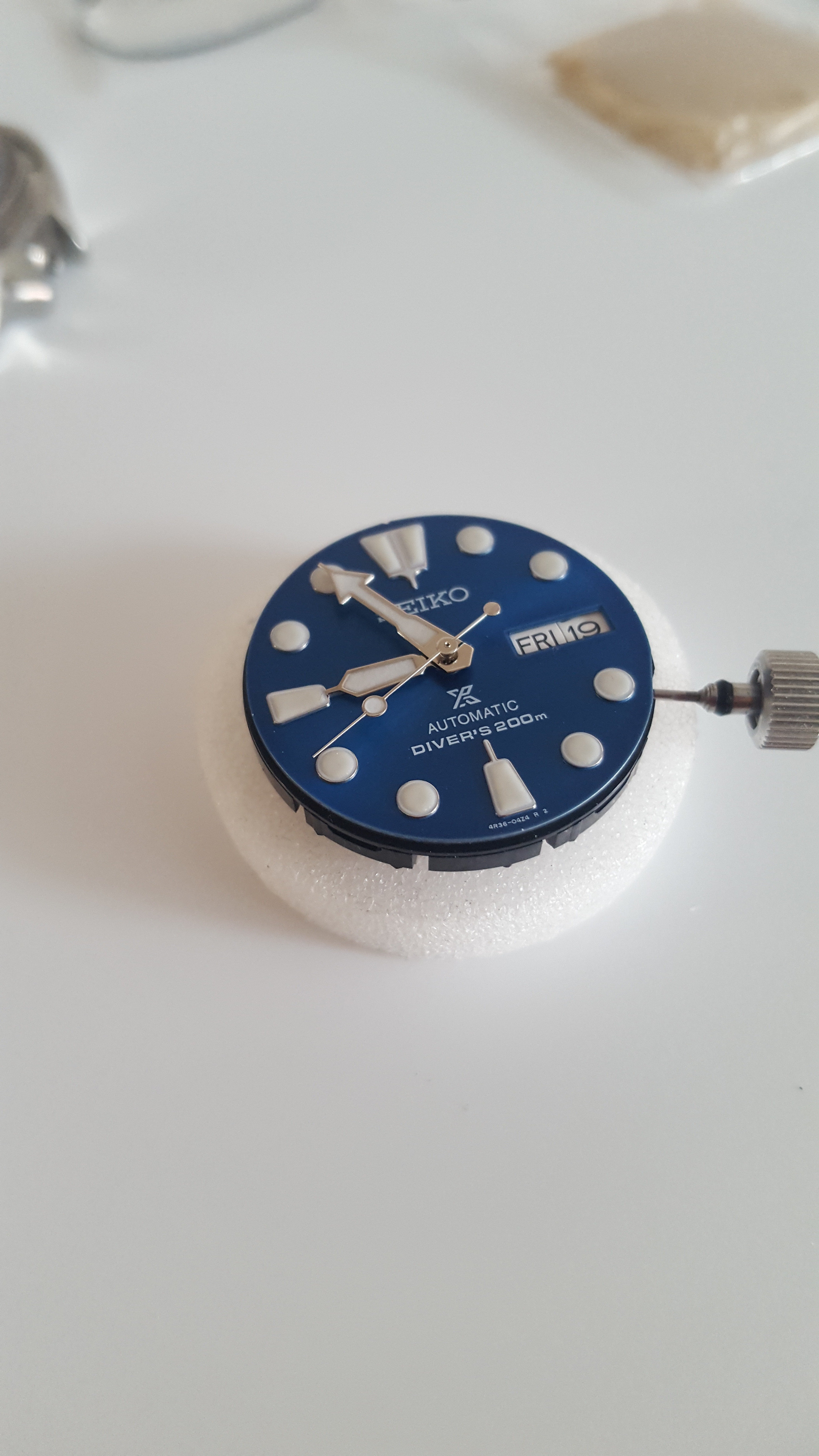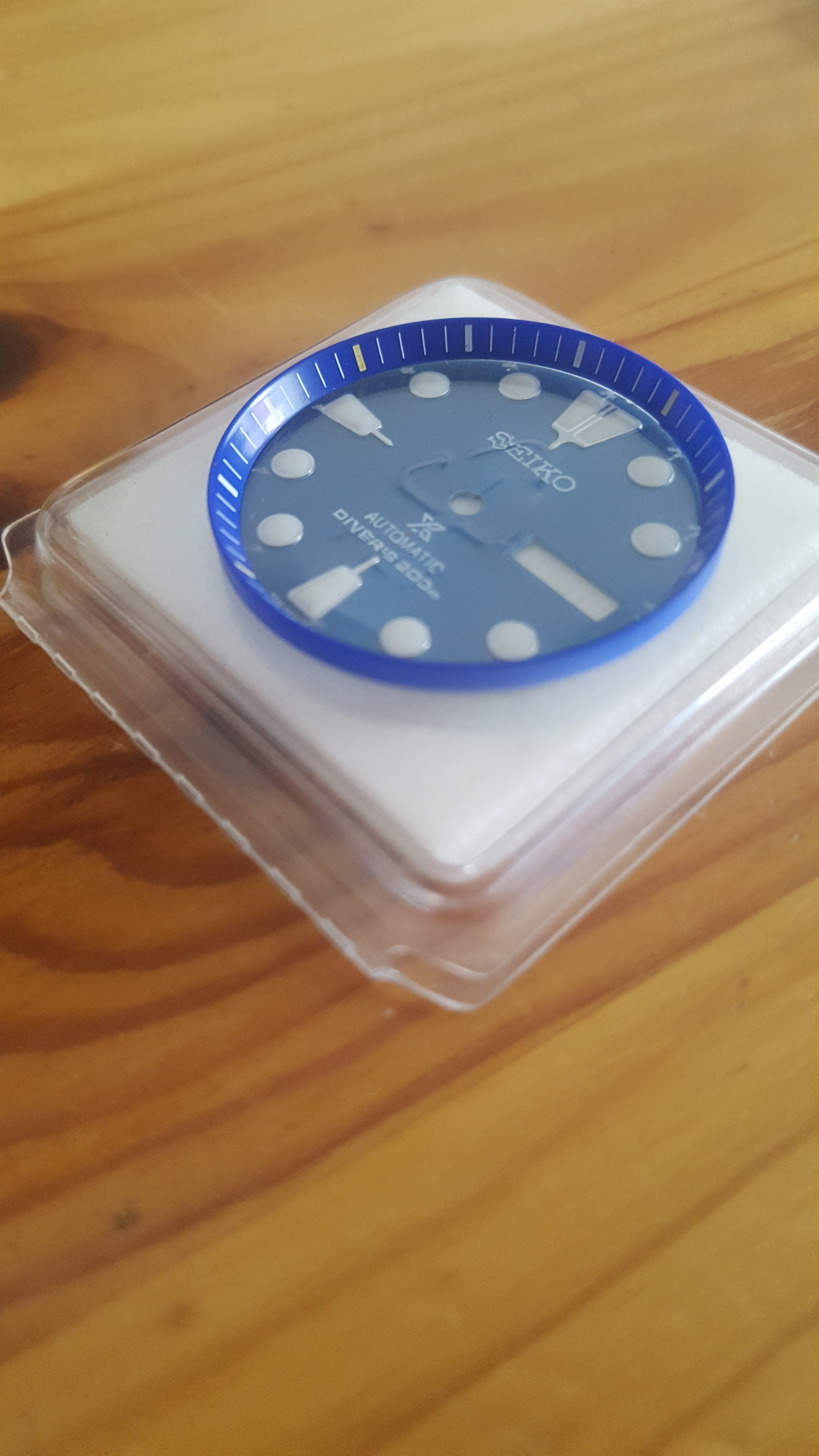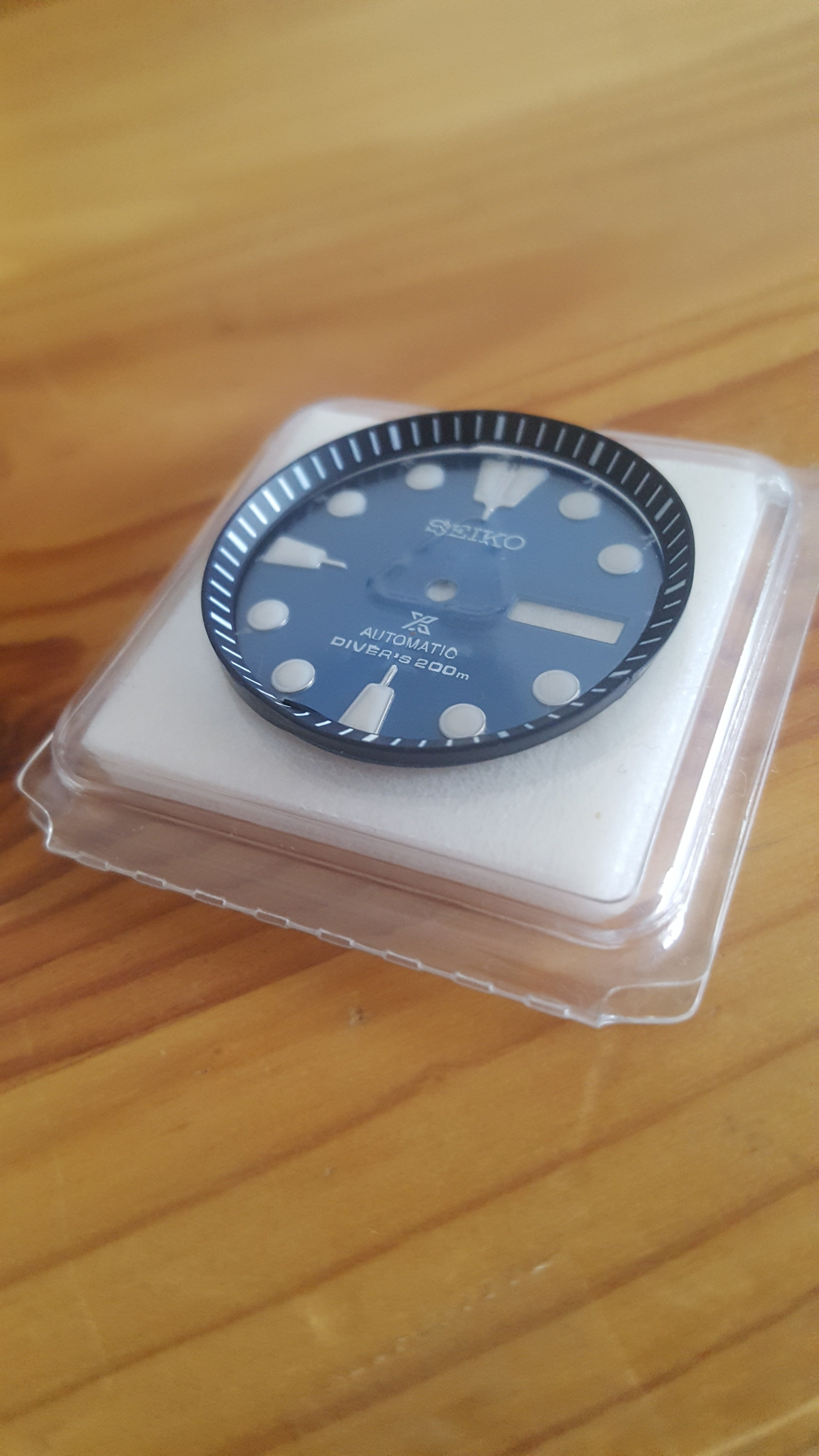 Gelukkig heb ik een uurtje terug een gloednieuwe old stock kunnen vinden van dezelfde verkoper als de oorspronkelijke. Hier gaat denk ik een blauwe plaat in of een knalrode als Seiko die ooit heeft geproduceerd (mocht je een model te binnen schieten met een rode plaat, dan hoor ik het graag) en saffier natuurlijk.