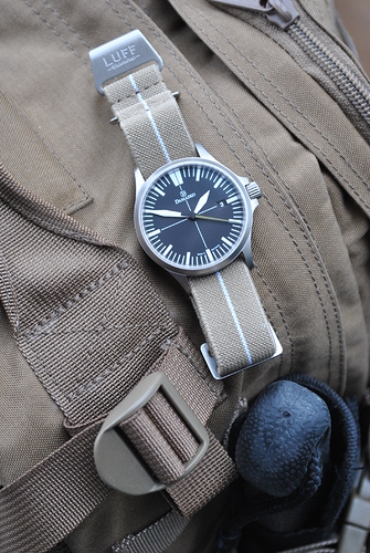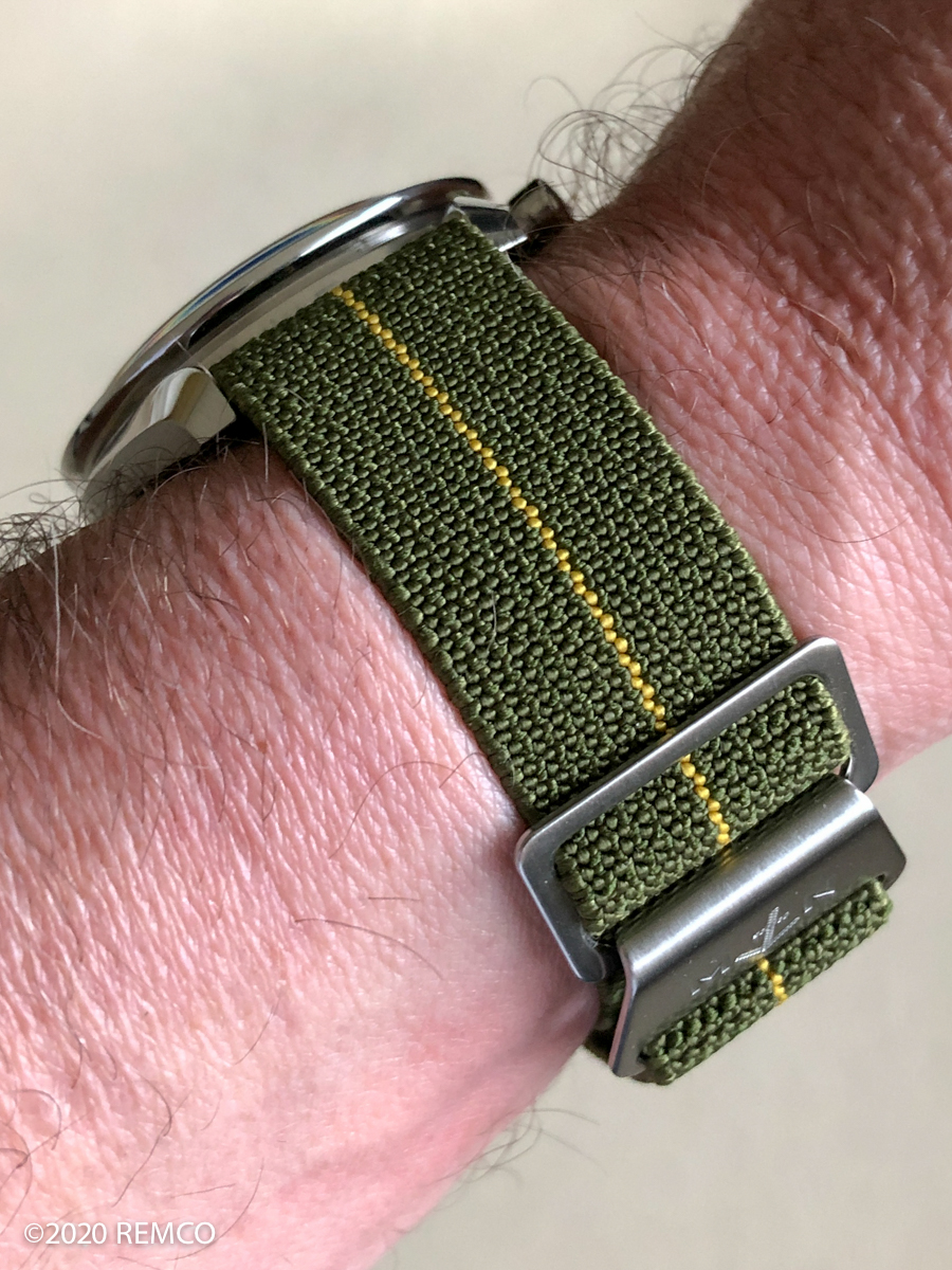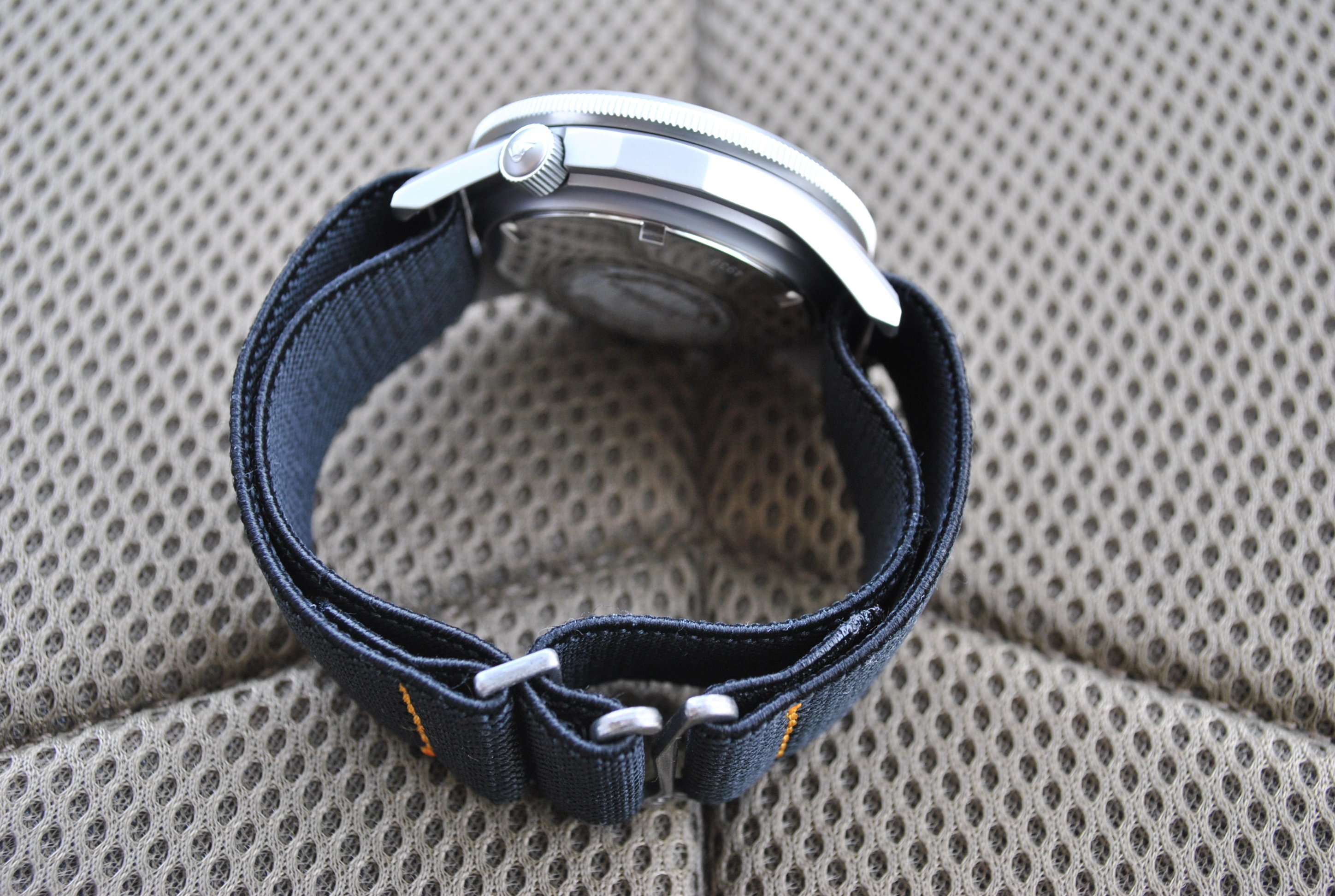 Deze foto geeft het niet weer, maar het is heel lichte synthetisch webbing. Made in China. Hetzelfde als dat van Cheapestnato of Straphospere. Die heb ik in het verleden gehad, maar ik koop nog liever een Breitling dan dat ik deze straps nog eens opnieuw zou kopen voor een review. Conclusie: alle webbing in deze prijscategorie is hetzelfde.