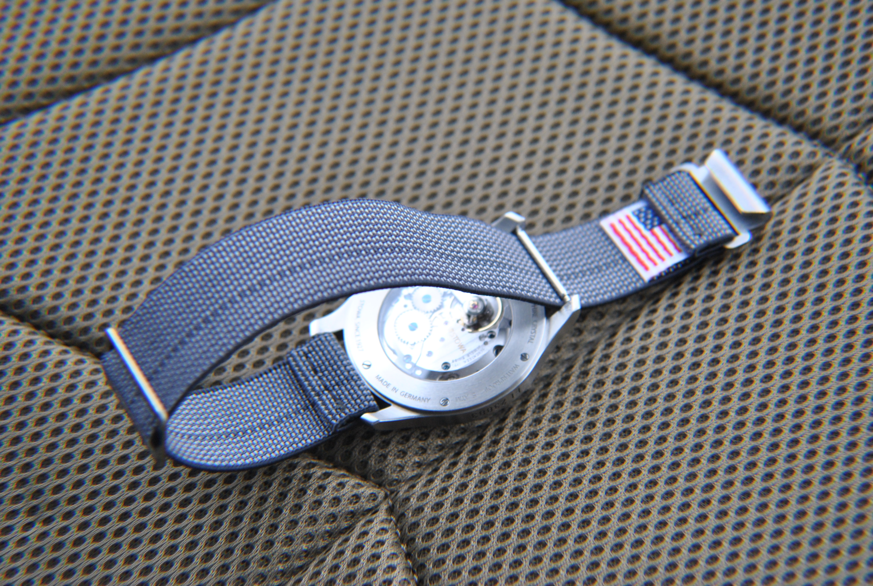 Daar waar het allemaal mee is begonnen. De man van Erika is ook een horlogegekkie, en hij vroeg aan Erika of hij zo’n kek Marine Nationale bandje voor zijn Doxa kon maken. Erika was al handig met lederen dingen knutselen. Uiteindelijk is ze via de Franse luchtmacht aan wat oude militaire webbing gekomen. Ze heeft hiermee geëxperimenteerd tot ze bij het huidige design was gekomen. Blijkbaar was niemand nog op dat idee gekomen, dus heeft ze het ontwerp laten patenteren.