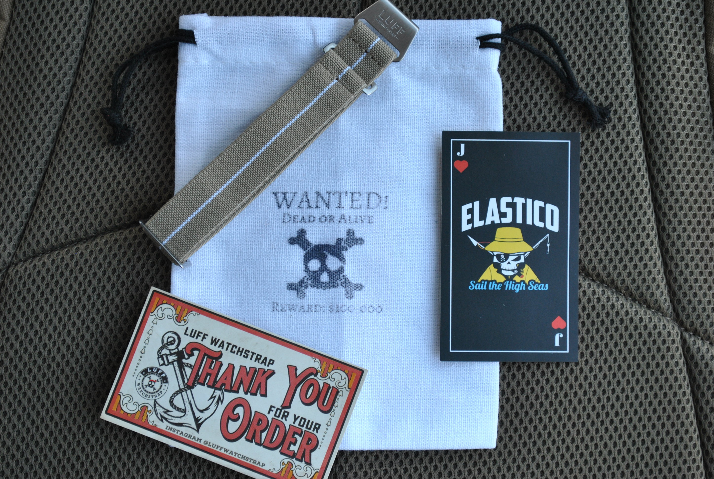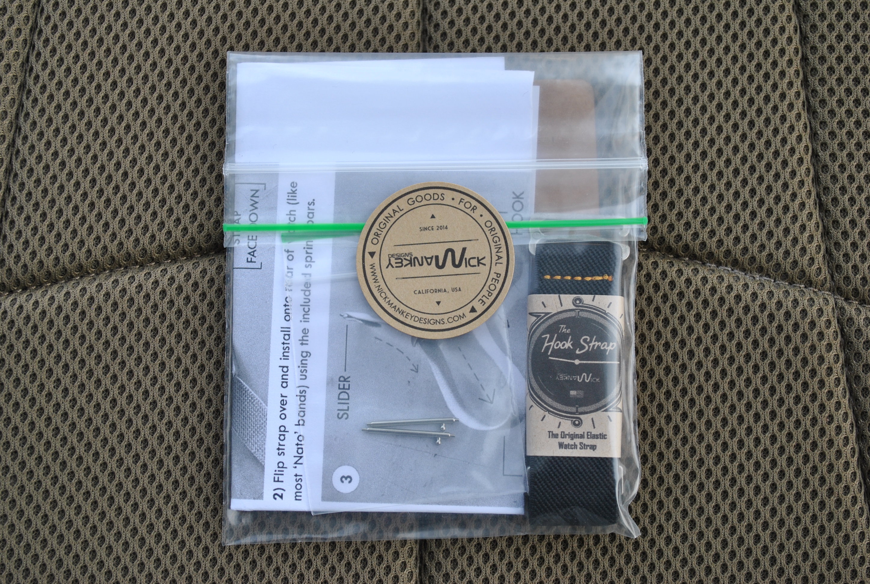 Deze keer heb ik gekozen voor de minimalistische versie, omdat je dan niet het extra stuk stof onder je caseback hebt. Dit geniet vooral mijn voorkeur voor de wat dikkere horloges in verband met de totale hoogte op de pols. De Mishap series is eigenlijk een soort van neukfout in de webbing, maar ik vind het er cool uit zien. Het pakketje is als vanouds, een Look-O-Look snoepverpakking met een bandje erin, gebruiksaanwijzing, losse sticker en…hee…waar is mijn sticker met de Stars and Stripes? Die zit er dus niet meer bij. Meh, die wilde ik graag op mijn hutkoffer plakken.