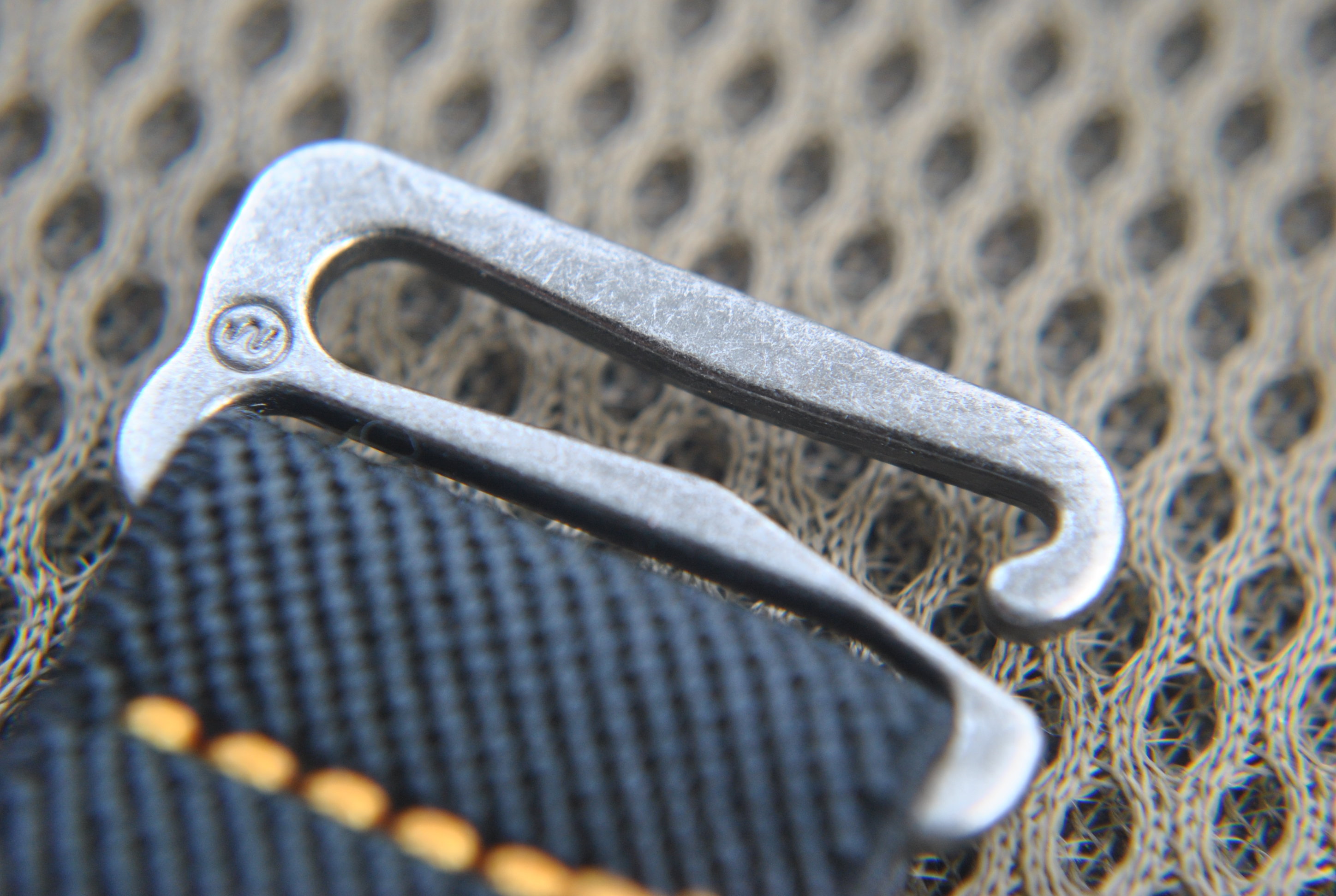 De hardware is no-nonsense. Gewoon vies staal met het logo er in-gelaserd en vooral zonder al teveel oog voor detail. De gesp is net zo. Het stiksel idem, gewoon erdoor geramd, hoppa knoopje erin en klaar. Zo had ik het ook kunnen doen zeg maar.