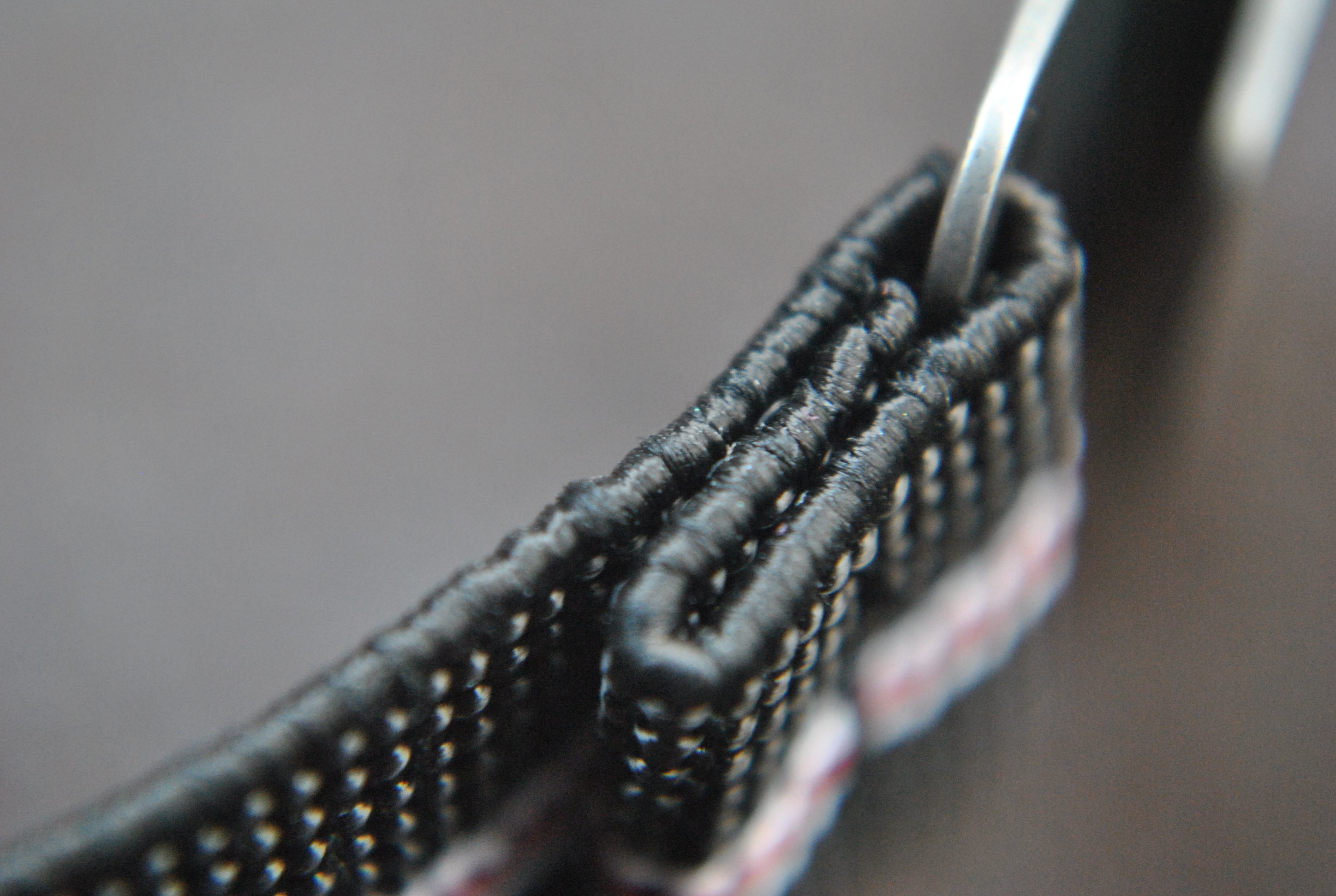 De webbing is maar mwoah. Het is geen synthetisch webbing, maar eerder gemaakt van katoen of hennep. Het is niet zo stevig en voelt eerder fragiel. Dit gaat ongetwijfeld rafelen en pluizen, zoals je hier en daar ziet op de foto’s. Deze is ongedragen en komt zo uit de verpakking. Ik kan me voorstellen, dat dit na verloop van tijd niet mooi wordt. Er zit veel rek op het materiaal, en ik denk dat het bandje uiteindelijk zijn vorm gaat verliezen, net als de elastiek in je goedkope boxershort van de Primark.