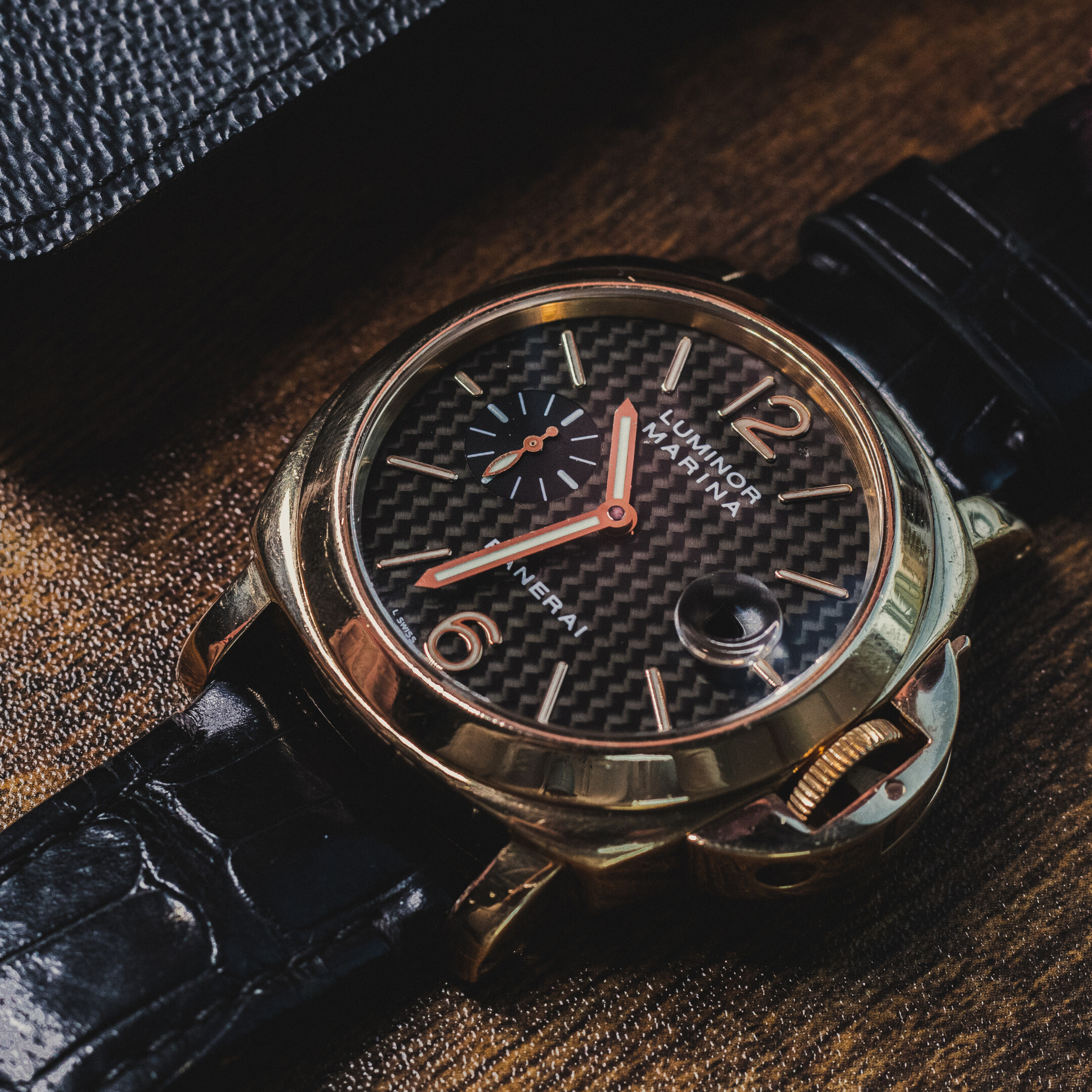 The different materials used in this chunky banger provide unusual contrasts. A gold diving watch on a leather strap that is not meant to get wet, faced with a carbon fiber dial more reminiscent of motor sports. But it is precisely this play of opposites that makes it a watch that stands out, without compromising the pure Panerai feel.