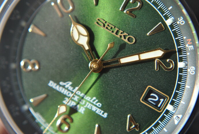 Tsja,groen met goud. Wie verzint zoiets? Zum kotzen! Op de een of andere manier, hebben ze het bij Seiko voor elkaar gekregen om er een passend geheel van te maken. De groene sunburst plaat speelt met het licht, zoals een jong tienermeisje vol hormonen speelt met je…oke, we dwalen af maar je begrijpt wat ik bedoel. Ik wist niet dat er zoveel verschillende smaken van groen waren, maar deze dial laat ze allemaal zien.