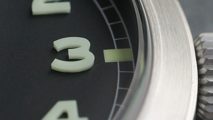 Het huzarenstukje van dit apparaat. De gegoten Arabische cijfers van super-Luminova, de centrale seconde dial en fancy hands onder het gebolde saffierke. Boring, bot not so boring.
