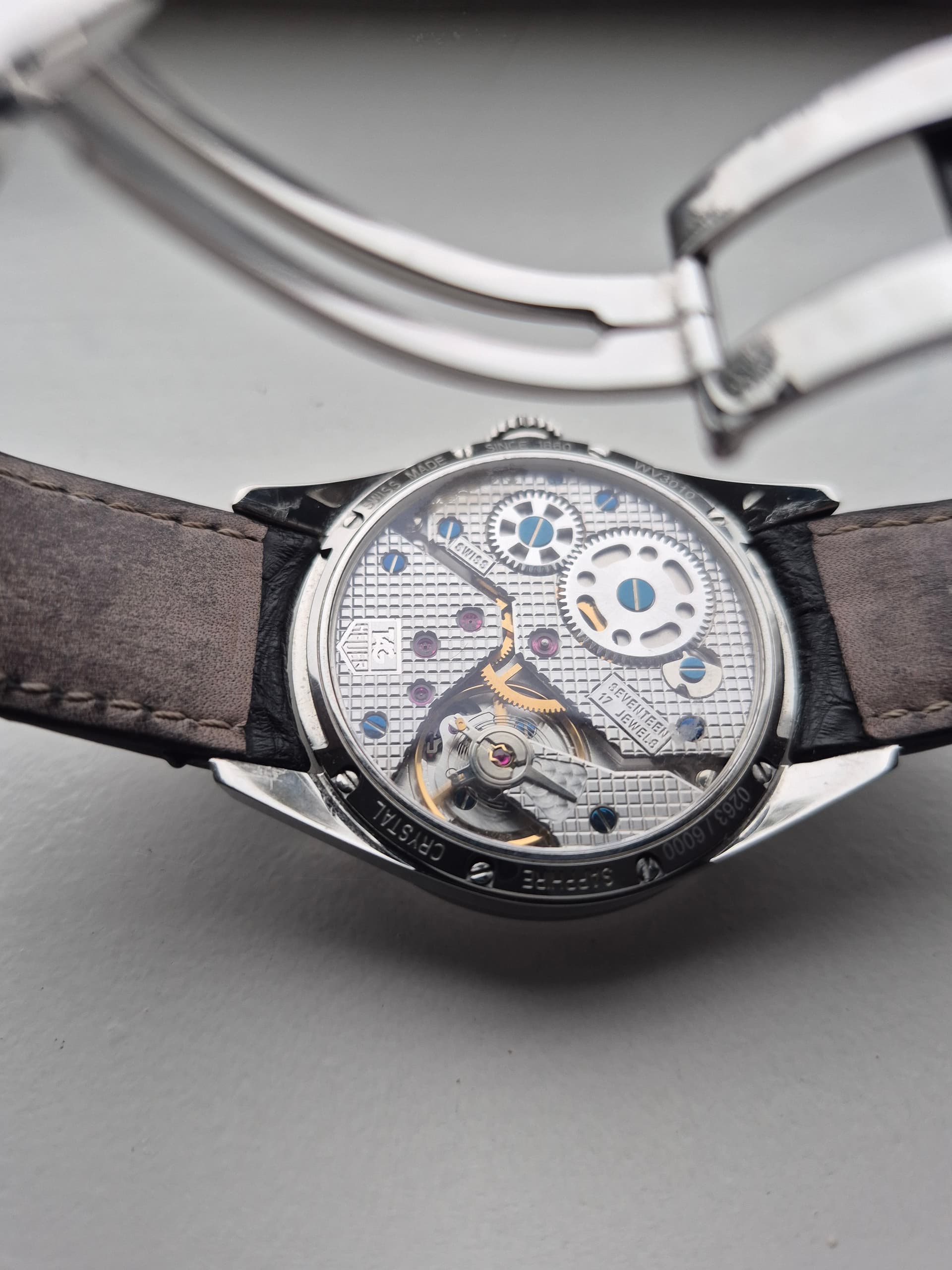 Dit is een bijzondere handwinder. De Zenith El Primero is bekend als (één van de) eerste automatische chronografen, maar dit is de HW, de handwindversie. Voordelen: dunner uurwerk en dus dunnere kast, robuuster uurwerk en lagere onderhoudskosten en als bonus, mooier zicht op het uurwerk door de zichtbodem omdat de rotor niet in de weg zit.