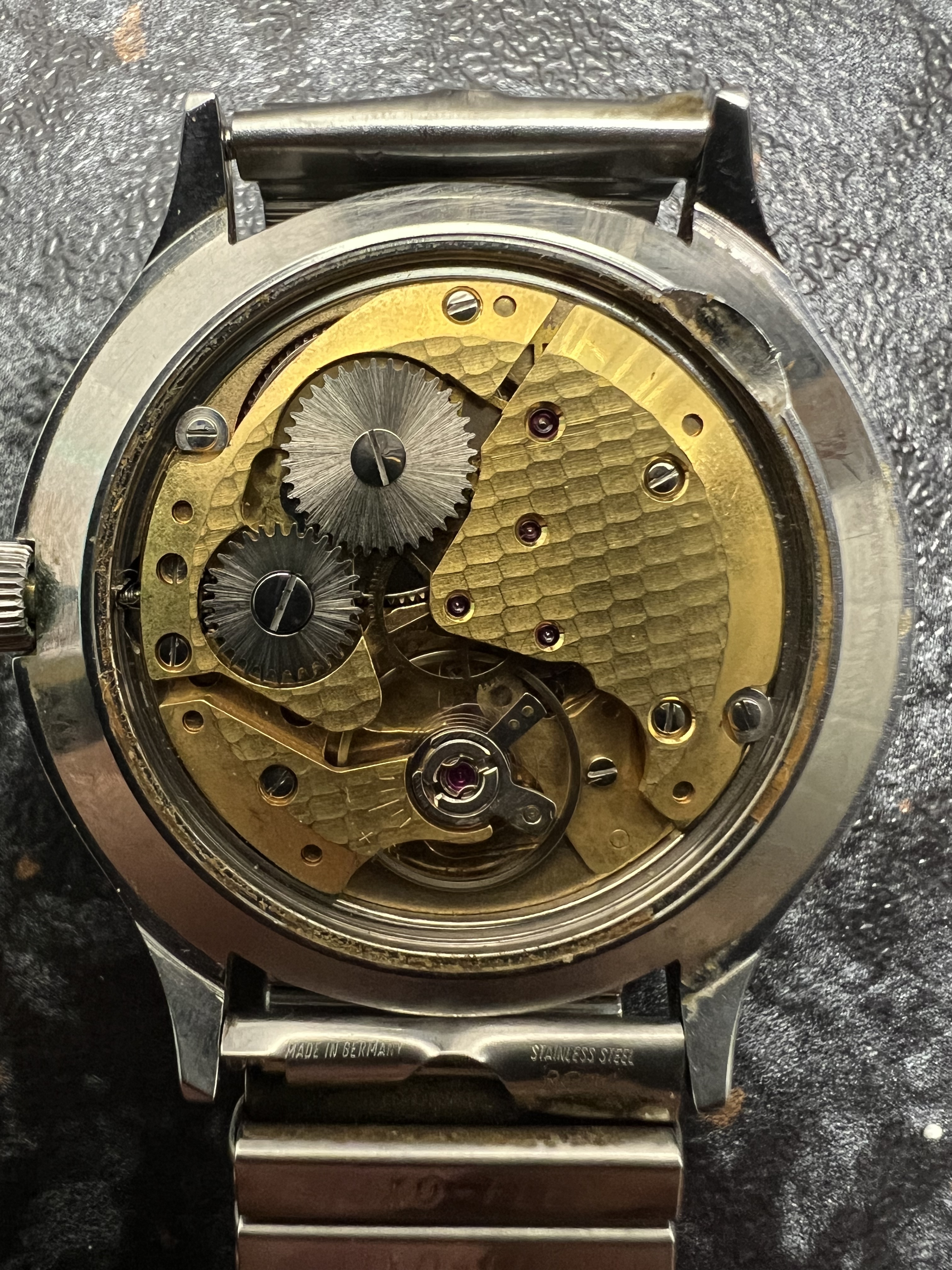 Lijkt een prima uurwerkje, robijn gelagerd, schokbescherming. De experts hier weten vast wel uit te vissen om welk uurwerk het gaat. Misschien Duits of Frans aangezien het anders zo prominent op de wijzerplaat gedrukte Swiss Made ontbreekt.