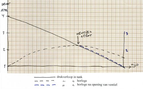 Zo’n maatregel, het ‘heliumventiel’, zou dus reeds in de tank, meteen als het evenwicht bereikt is, automatisch moeten opengaan om schade te voorkomen. De druk zal dan de blauwe onderbroken lijn volgen, en het eindresultaat is geen overdruk in het horloge.
