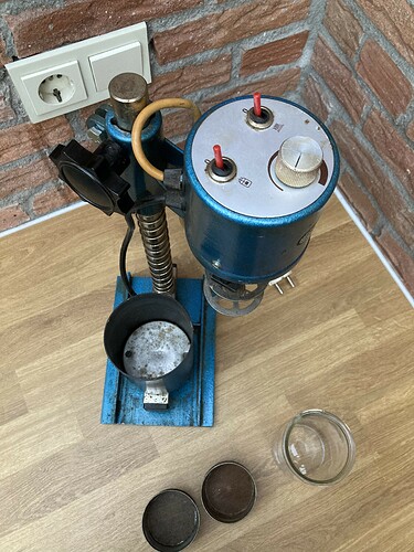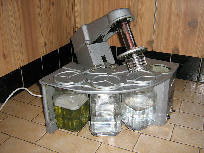 Die ronde glazen pot hoort eigenlijk niet bij de machine, normaal horen dat vierkante potten te zijn zoals lassale in zijn machine laat zien. In ronde potten kun je niks schoonkrijgen omdat het schoonmaak vloeistof even hard mee rond gaat draaien als de korf, Daarom worden vierkanten potten gebruikt zodat er een werveling ontstaat. Om jou schoonmaakmachine in orde te krijgen zal je 3 vierkante potten met deksel moeten zoeken. Dan zal je een korf houder en de korfjes moeten aanschaffen. Daarna zal je een vierkante bak moeten maken, waar je de metalen voet van de machine op vast kan zetten op de bodem van de bak, kan van hout, dan wat ruimte en weer een plaat waar je de potten in kan zetten. Zoals lassale in het rond heeft kun je die ook vierkant maken zodat je de zijkanten makkelijker dicht kunt maken.