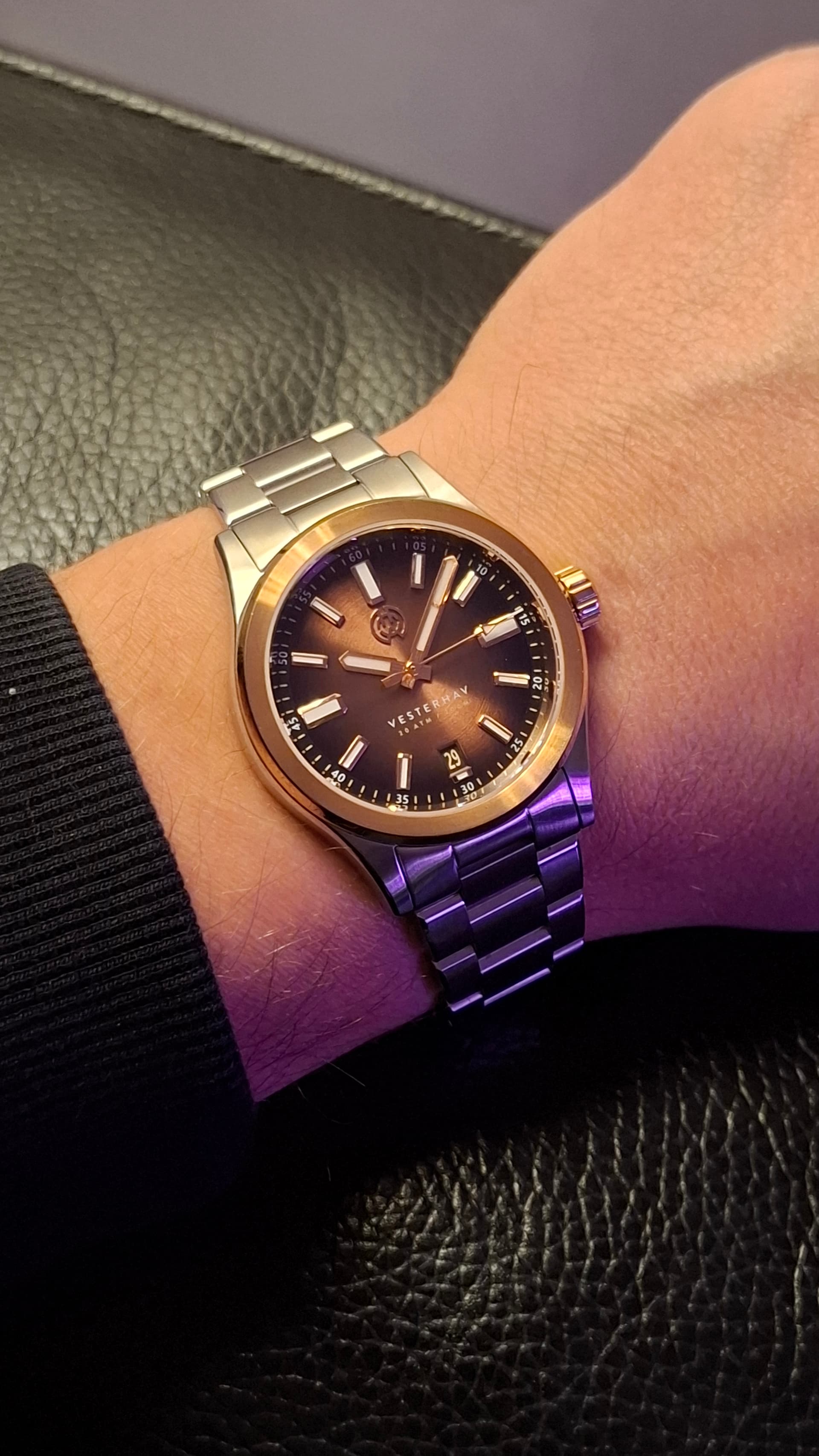 Zeer strakke en weinig gedragen Henry Archer. Echt een Bang for Buck horloge welke een super afwerking heeft voor de prijs. Mooie solide 3link band, vanzelfsprekend solid endlinks met dubbele quick release en feilloze snelverstelling in de clasp. Wijzerplaat heeft een fume afwerking van zwart naar een hele warme amber tint. De kroon en bezel hebben afwisselend gepolijste en geborstelde zijdes, afgewerkt in rosé tint. 200M WR en mooie afmetingen maken dit een super draagbaar horloge. Sidenote: de 38mm vesterhav is niet meer verkrijgbaar in deze gelimiteerde kleurstelling.
