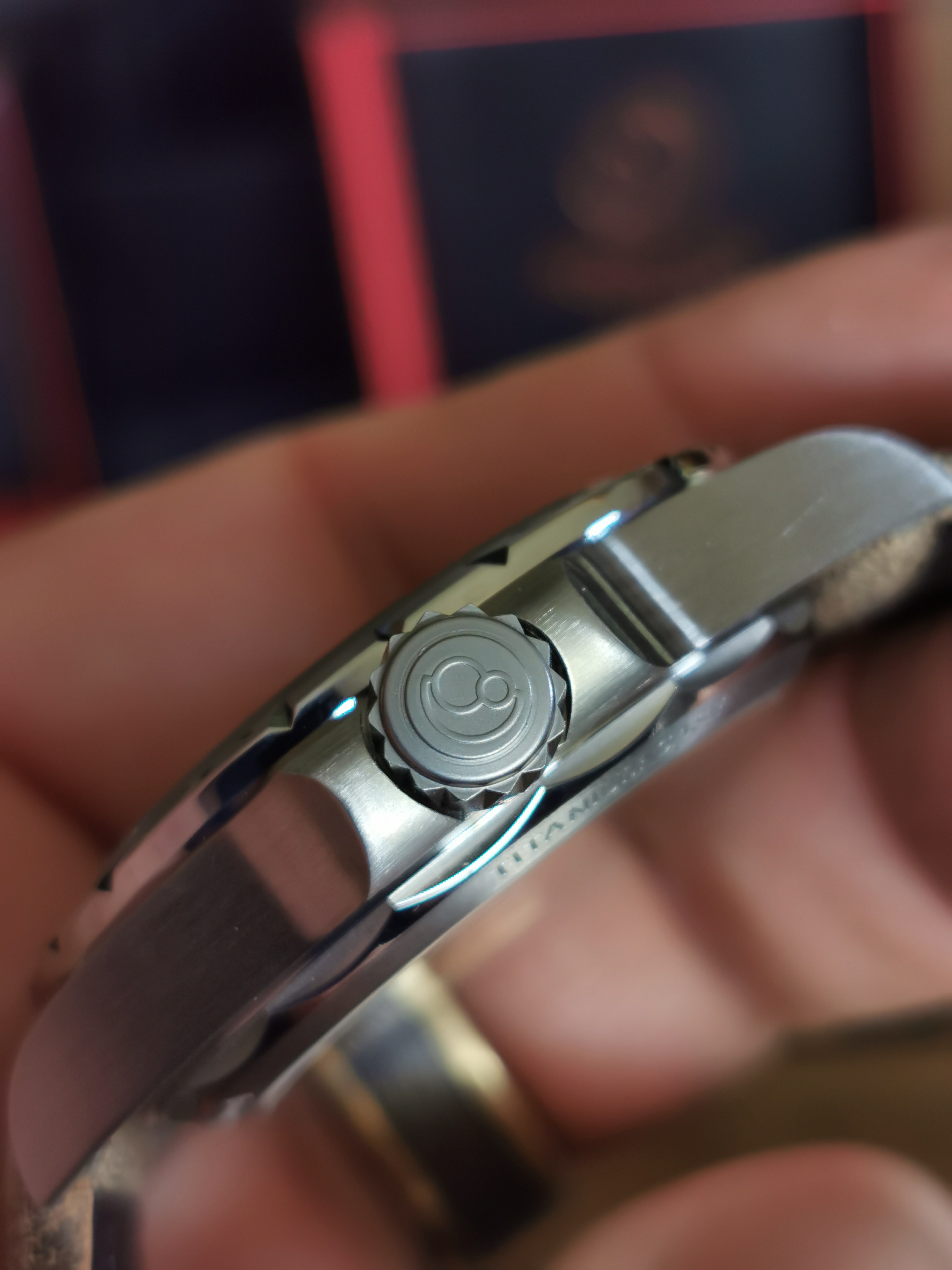 Achterzijde is een verhaal apart. De deksel is Titanium en saffierglas (jawel, voor en achterzijde saffierglas) en heeft geen inkepingen om het los te maken maar een soort “golfjes”bij gebrek aan een betere omschrijving. Scherpe en diepe graveringen met de bijzonderheden. Al met al een zeer fraaie combinatie met een zeer hoog niveau van afwerking. Het uurwerk is een 21 Jewels Hangzhou 7200 waar ik werkelijk niets over kan vertellen. Op internet is niet echt veel te vinden over dit specifieke type maar wat ik van Hangzhou vind vertelt mij dat het niet het beste en niet het slechtste Chinese uurwerk is. We zullen zien. Optisch is het een lust voor het oog. Grijs met een opvallende goudkleurige rotor en veer. Blauwe schroef in het midden en zilverkleurige schroefjes. Ik moet zeggen, ik heb lelijkere achterzijdes gezien.