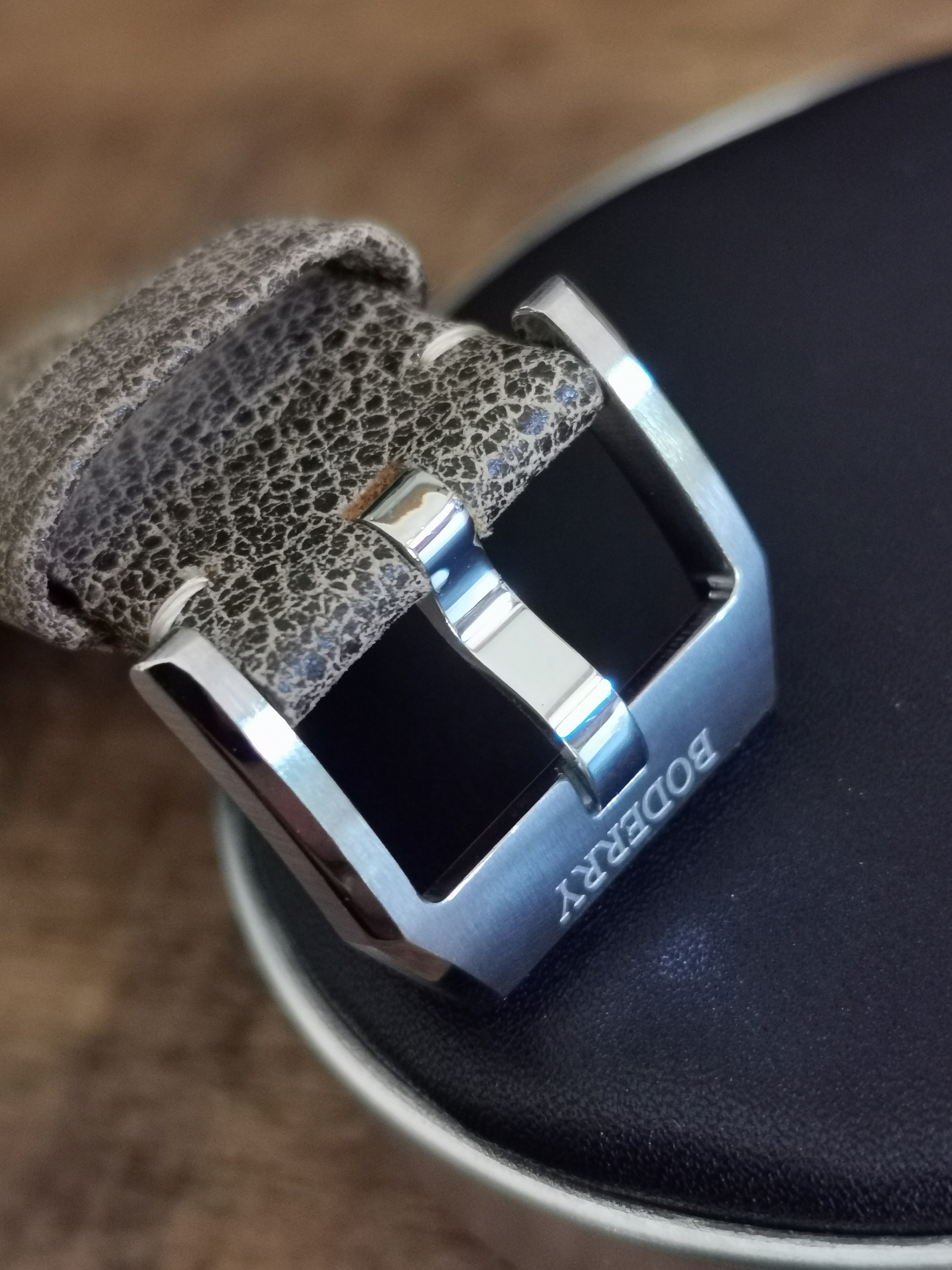 Er is een fraaie dikke lederen band geplaatst in een kleur die het beste is te omschrijven als “vintage leder” Er is een dunne laag leder gestikt tussen de band en de pols met het Boderry logo en naam erin. Er is een versteviging ingenaaid van de bandaanzet tot halverwege de band. De sluiting is matte en voorzien van gegraveerde Bpderry naam.