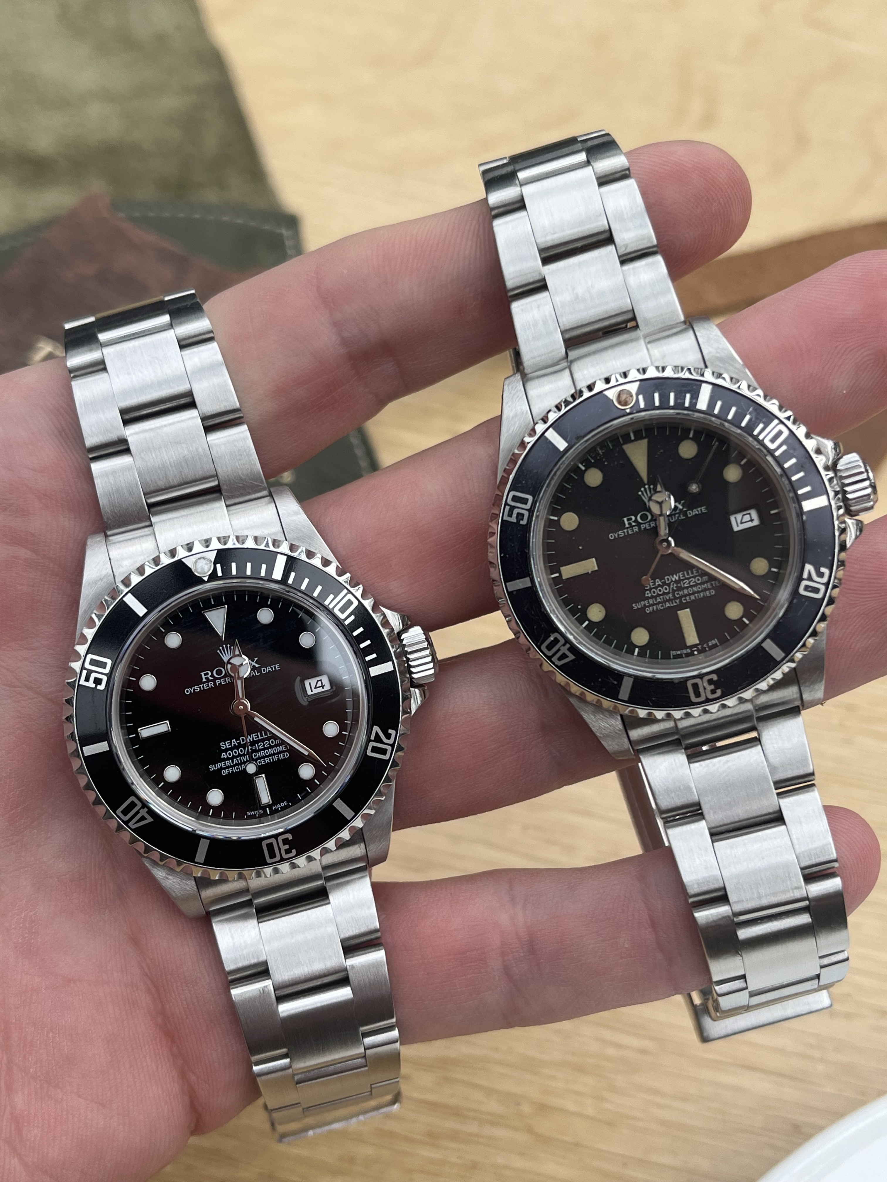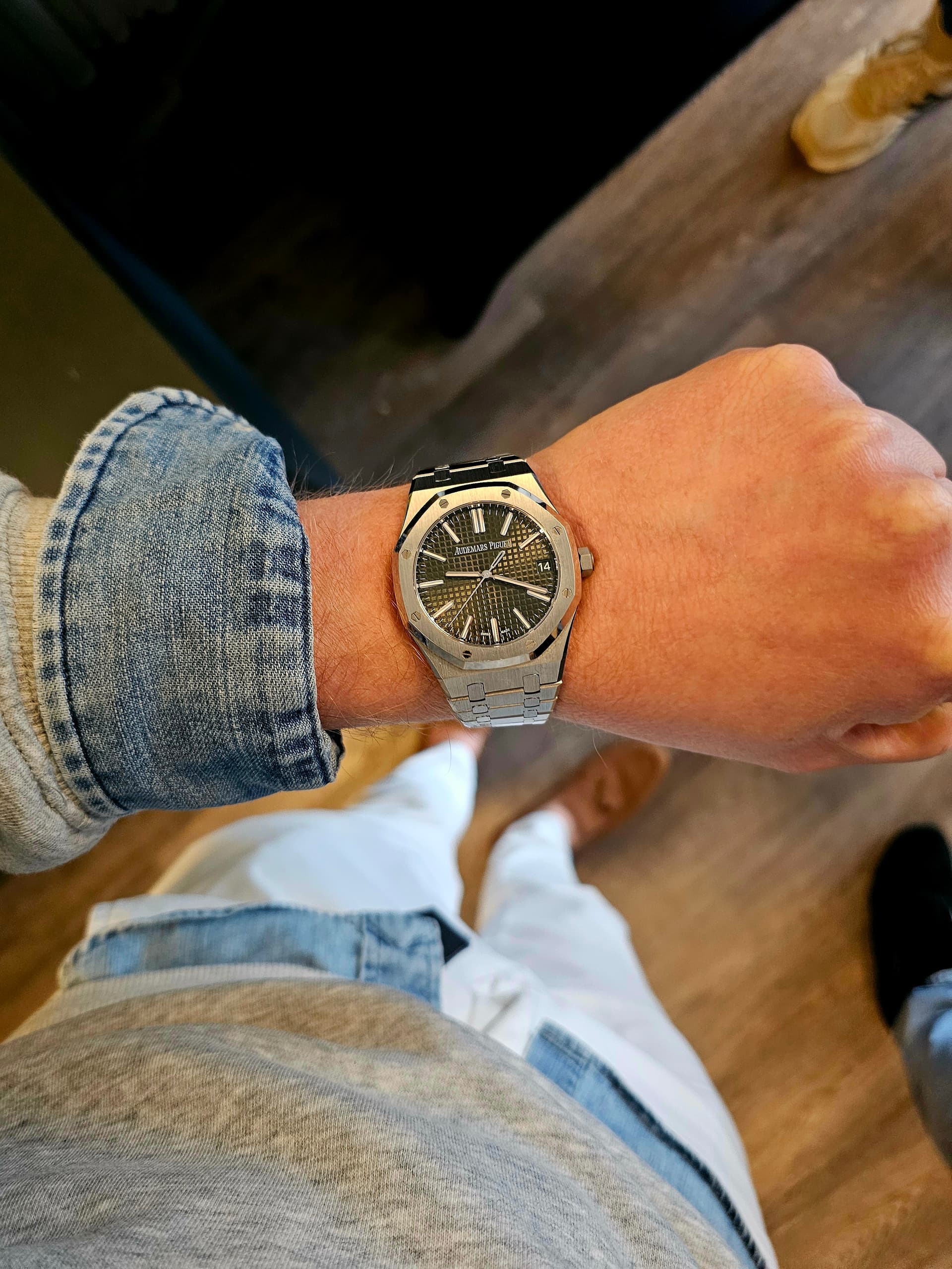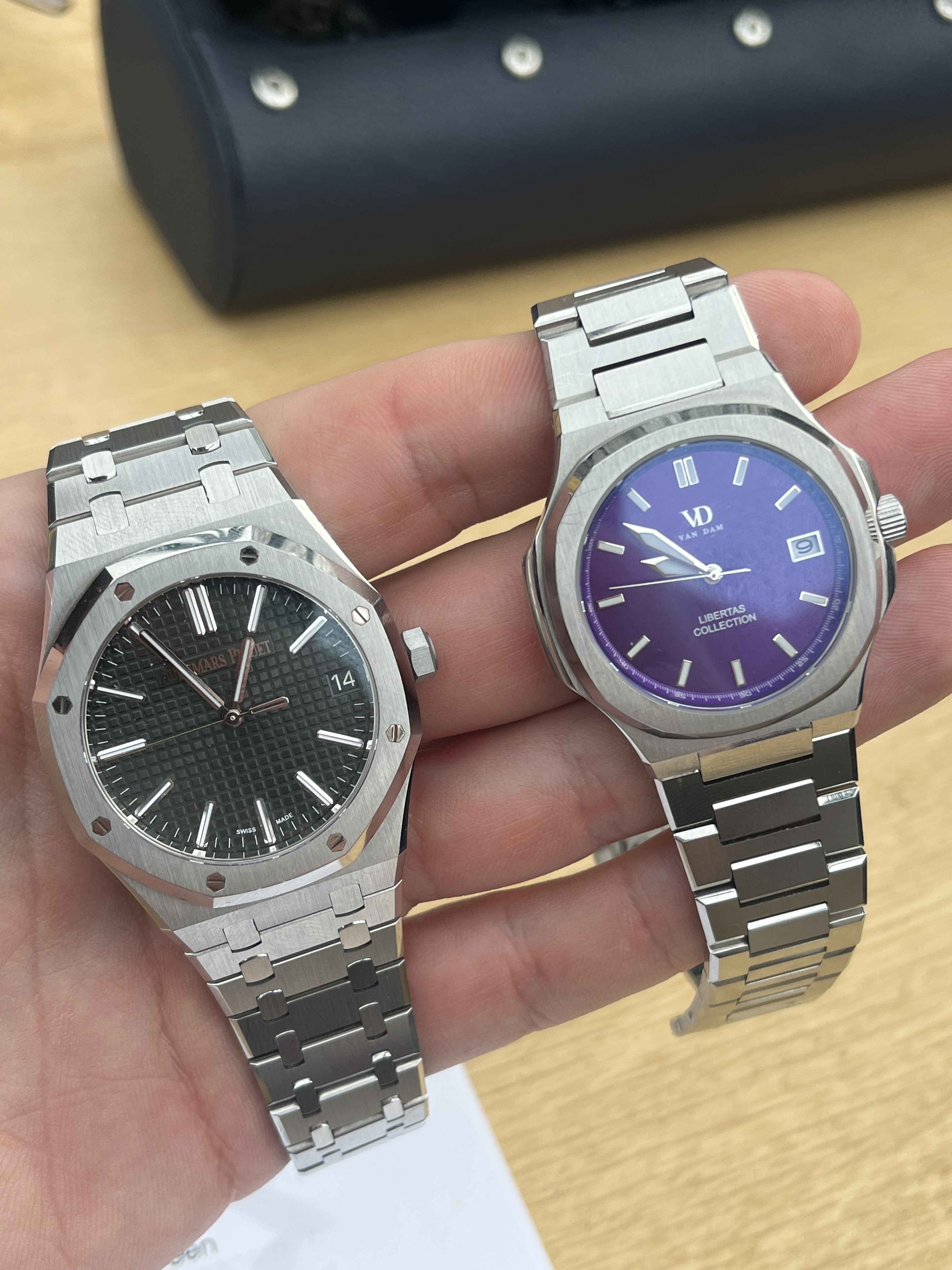 Tijdens de lunch kwamen er nog even een aantal horloges voorbij. Mijn 16600 even naast een 16660 gehouden. Same same, but different. En ray1981 zijn van Dam naast Bap zijn Royal oak kunnen houden. Dan is zo’n Royal oak toch wel echt heel erg overpriced. Dus Bap heeft hem volgens mij gelijk op chrono gezet voor 4K. Zo’n van Dam voor 4.5k, dat is pas echt waar voor je geld.