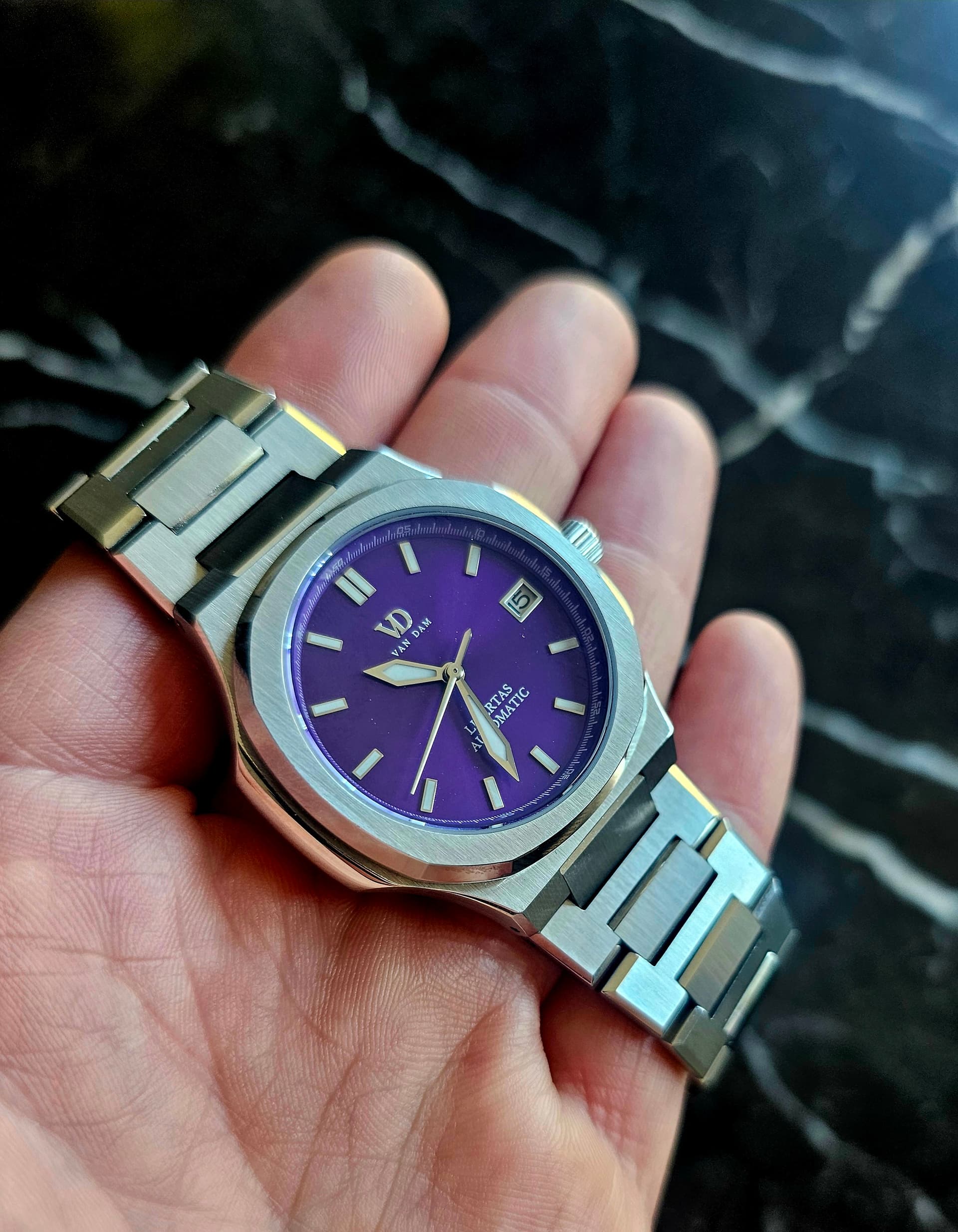 Ik heb hem die avond wat langer omgehad, wat een heerlijk horloge! Niet alleen stuk minder “scherp” dan op plaatjes maar vooral stuk kleiner en beter dragend dan ik verwacht had.