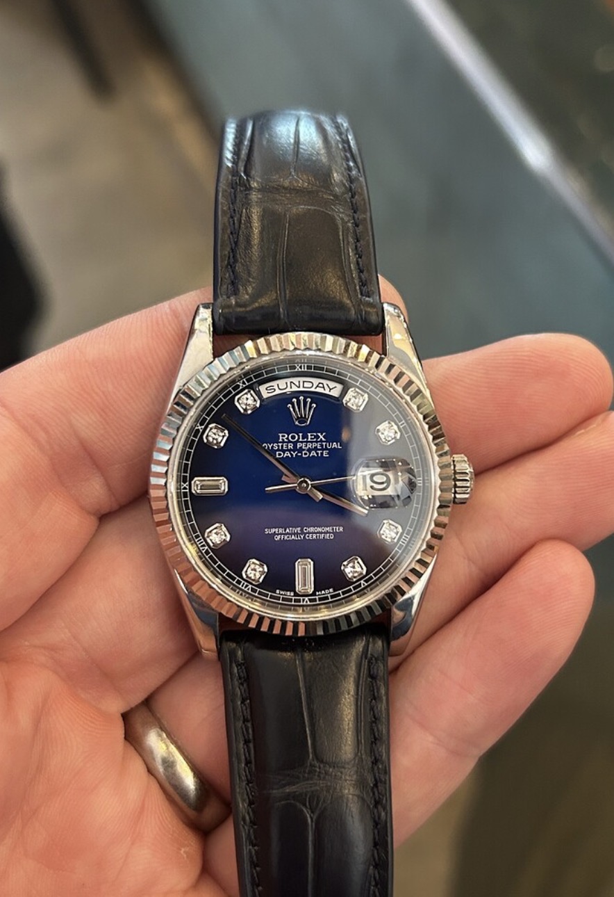 Band: Een lederen band met krokodillenstructuur. Hoewel de Day-Date het meest bekend is om zijn metalen “President”-band, zijn er varianten (vooral oudere of specifieke configuraties) die op leer worden geleverd.
