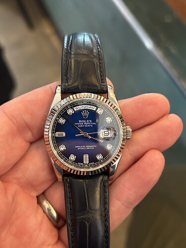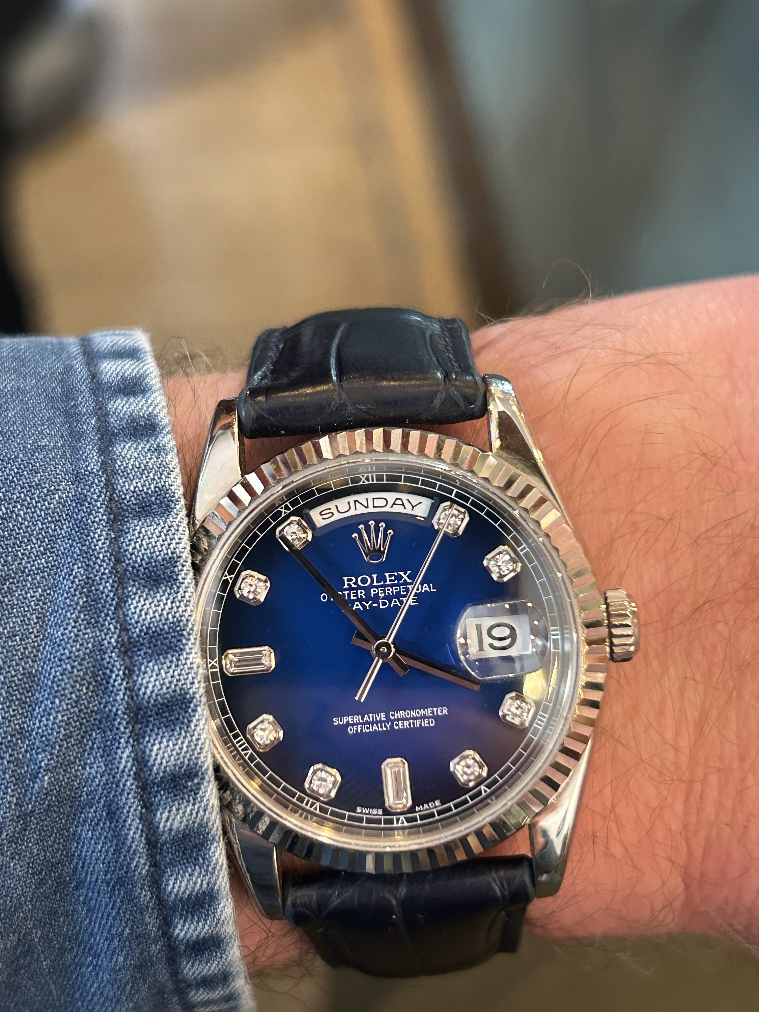 Als ik er naar kijk om mijn pols denk ik nog elke keer… Poeh… hij blijft mooi en nog elke dag ben ik er blij mee hem te kunnen dragen. Verder mag iedereen er van vinden wat men wil. Om toch nog jouw vraag inhoudelijk te beantwoorden: Dit is een Rolex 118239 met “Blue Ombre” wijzerplaat. (Een horloge wat vooral goed is in het aangeven van Tijd, Dag en Datum.)