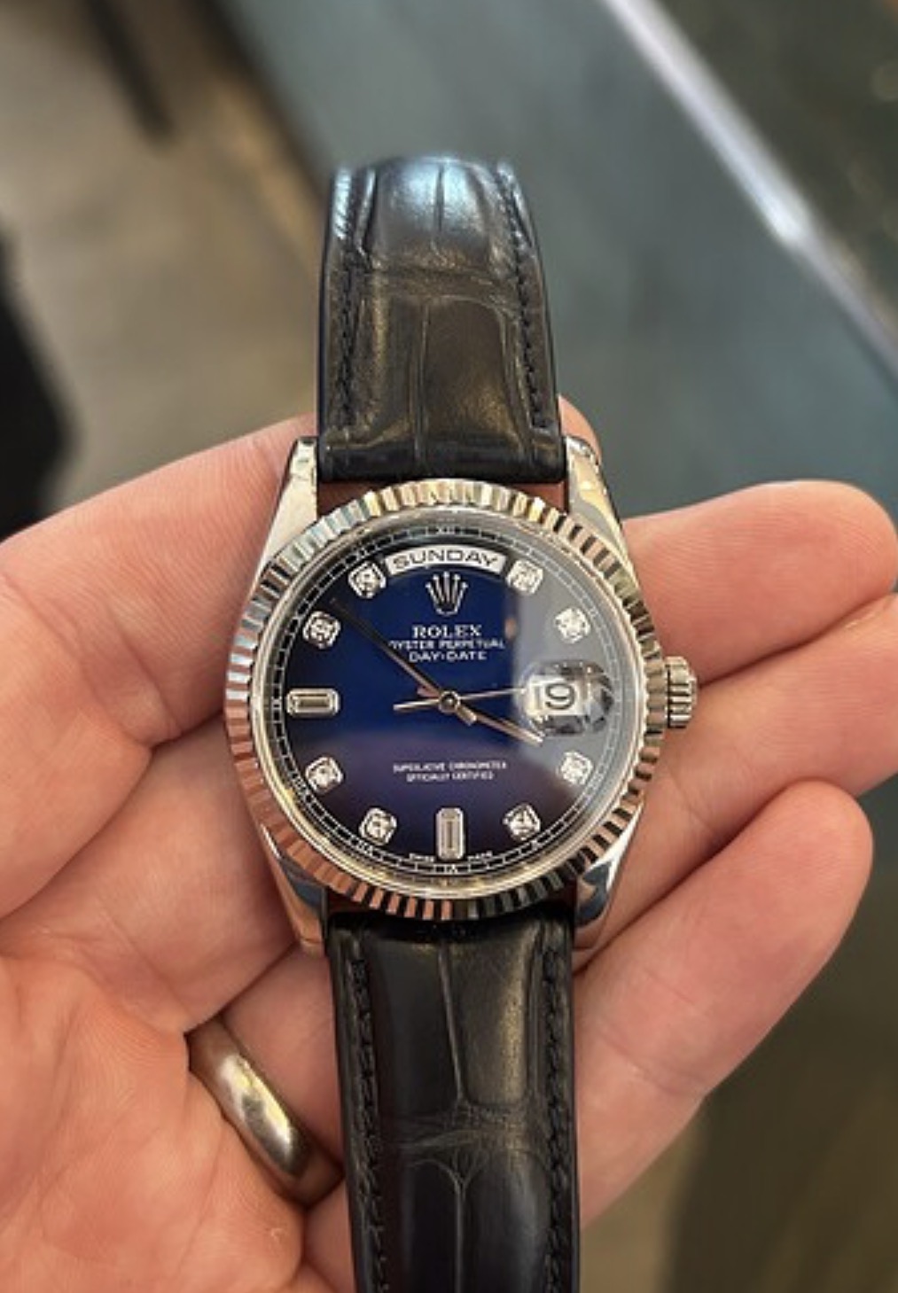Model: Day-Date (herkenbaar aan de dagschijf voluit geschreven op 12 uur en de datum op 3 uur).