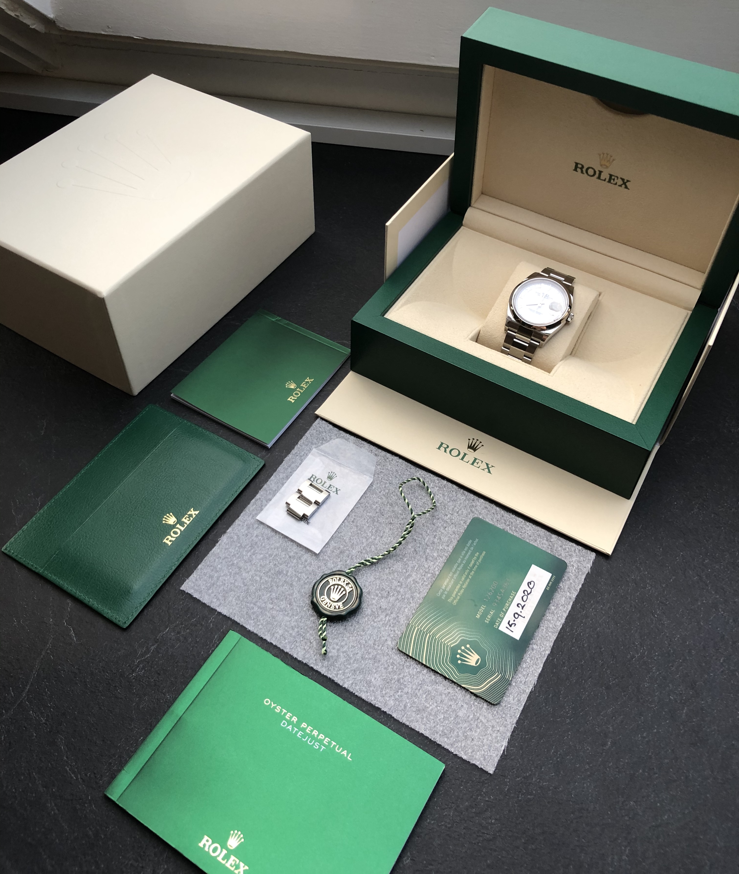Gebruiksaanwijzingen (2 boekjes), tag(serienummer etc.), certificaat (green tag), bezel protector, garantiekaart, doos (groen) en doos (creme).