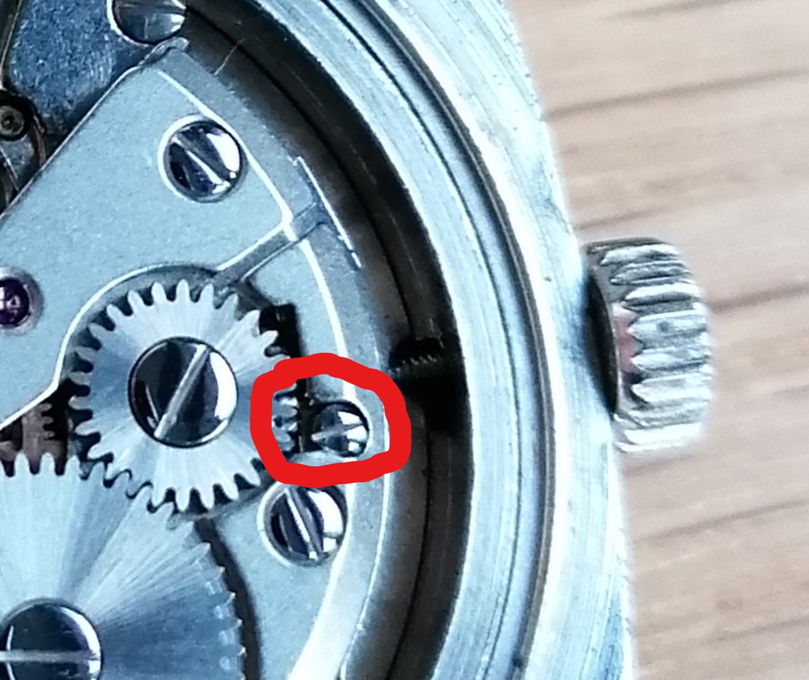 De rood omcirkelde “Tiretteschroef” voorzichtig losser draaien (niet helemaal los, anders heb je extra werk). Een halve slag per keer en dan voorzichtig even aan de kroon voelen of hij al los komt en anders nog een beetje losser.