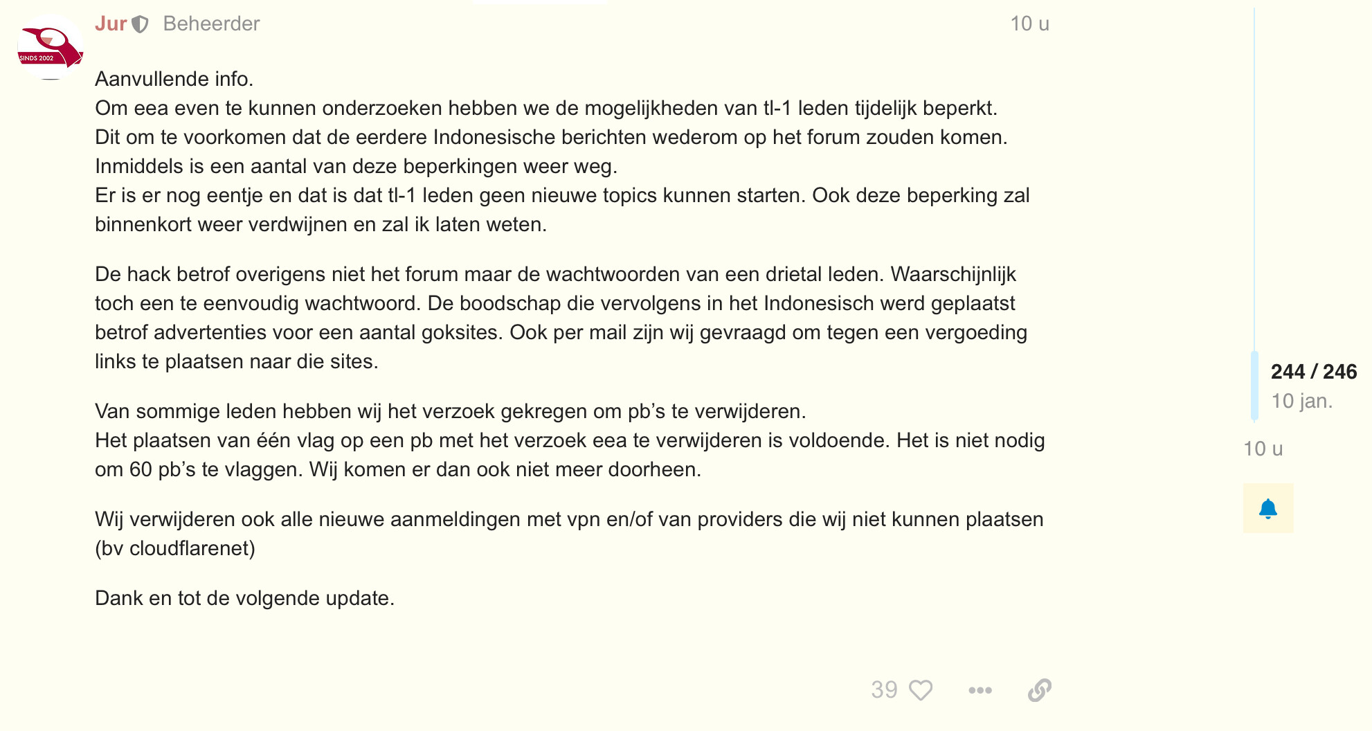 Nou nou nou. Ik geef het je te doen hoor, zon groot en actief forum als dit in de lucht te houden. Niet alleen met alle leden die overal over van mening verschillen maar ook met aanvallen van buiten af. Wat was het alternatief geweest? Minder snelle actie of zelfs niks doen? Dan had ik iedereen wel eens willen horen. Nee we konden nu eventjes ietsjes minder hier voor een paar uur. Er zijn ergere dingen. Heeft met Noord Korea niks te maken, integendeel juist. De maatregelen getroffen door de admins, die hier gratis en voor niks al hun tijd in steken, die maatregelen zijn juist vóór ons, niet tegen.