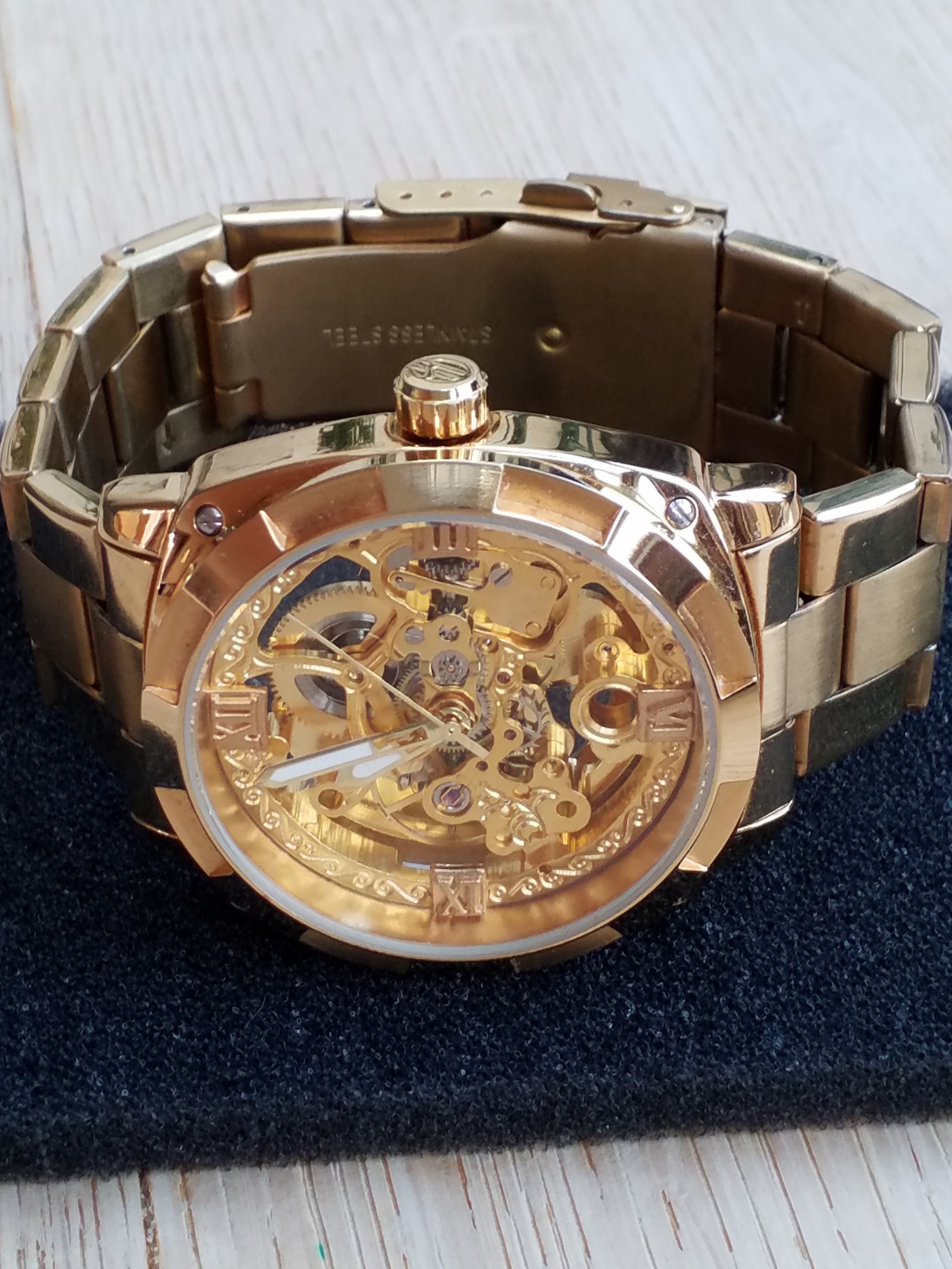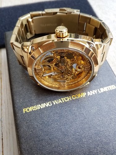 Een gouden doorkijk automatic van de Forsining Watch Comp Any Limited. En het uurwerk loopt nog redelijk op tijd ook en dat voor een klein prijsje.