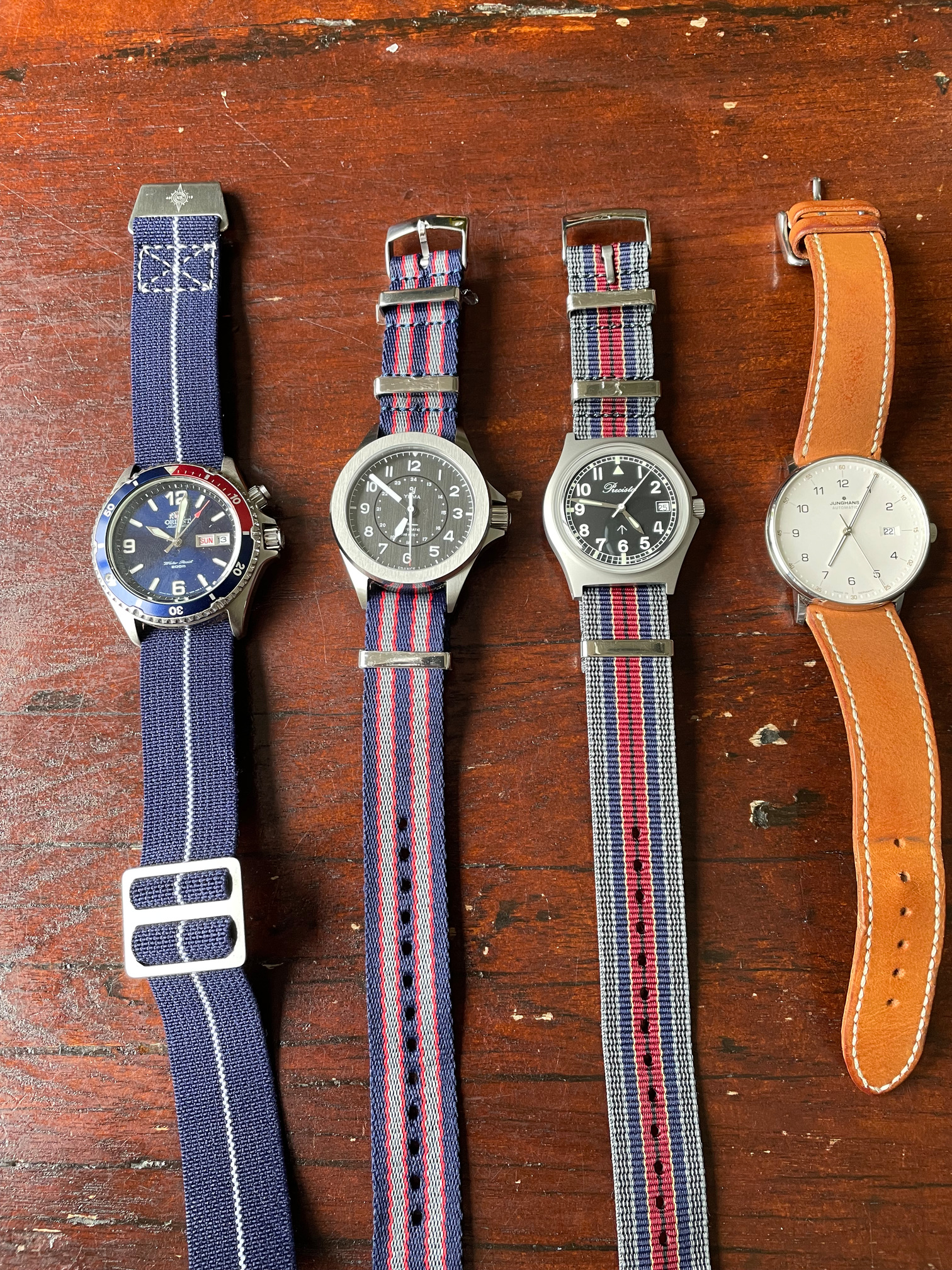 Helaas passen niet alle bandjes; de MN staat mooi maar is te kort voor mij en de lichtbruine past niet tussen de lugs en het horloge. De rest staat best goed, maar nog wel wat wennen aan het dragen.