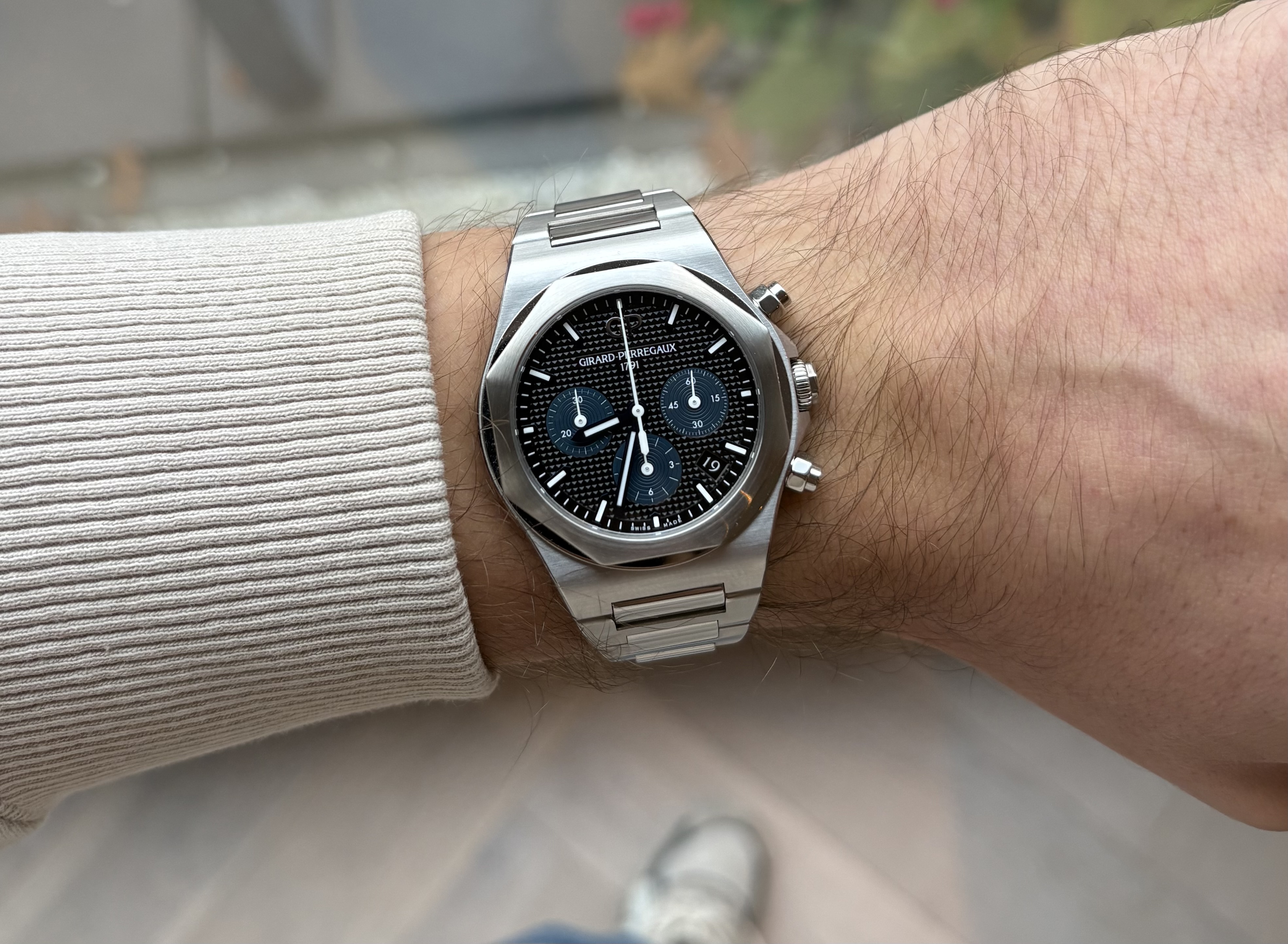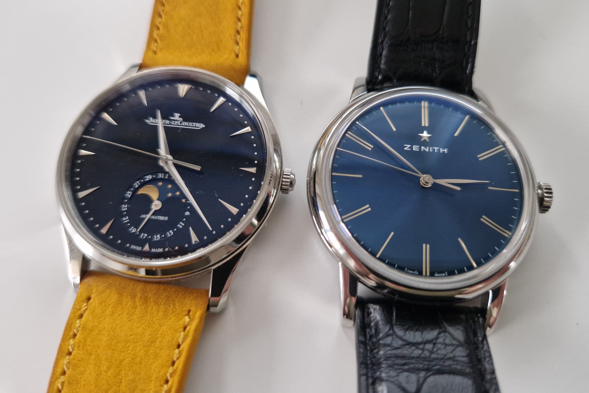 Door het verschil in prijsklasse niet, de Zenith pak ik anytime als het mij uit komt, JLC toch meer bij een pak (minder snel tijdens een thuiswerkdagje). De gedachte dat één een lichte plaat had kunnen hebben is wel door mijn hoofd gegaan, maar van beide vind ik de witte variant minder mooi.