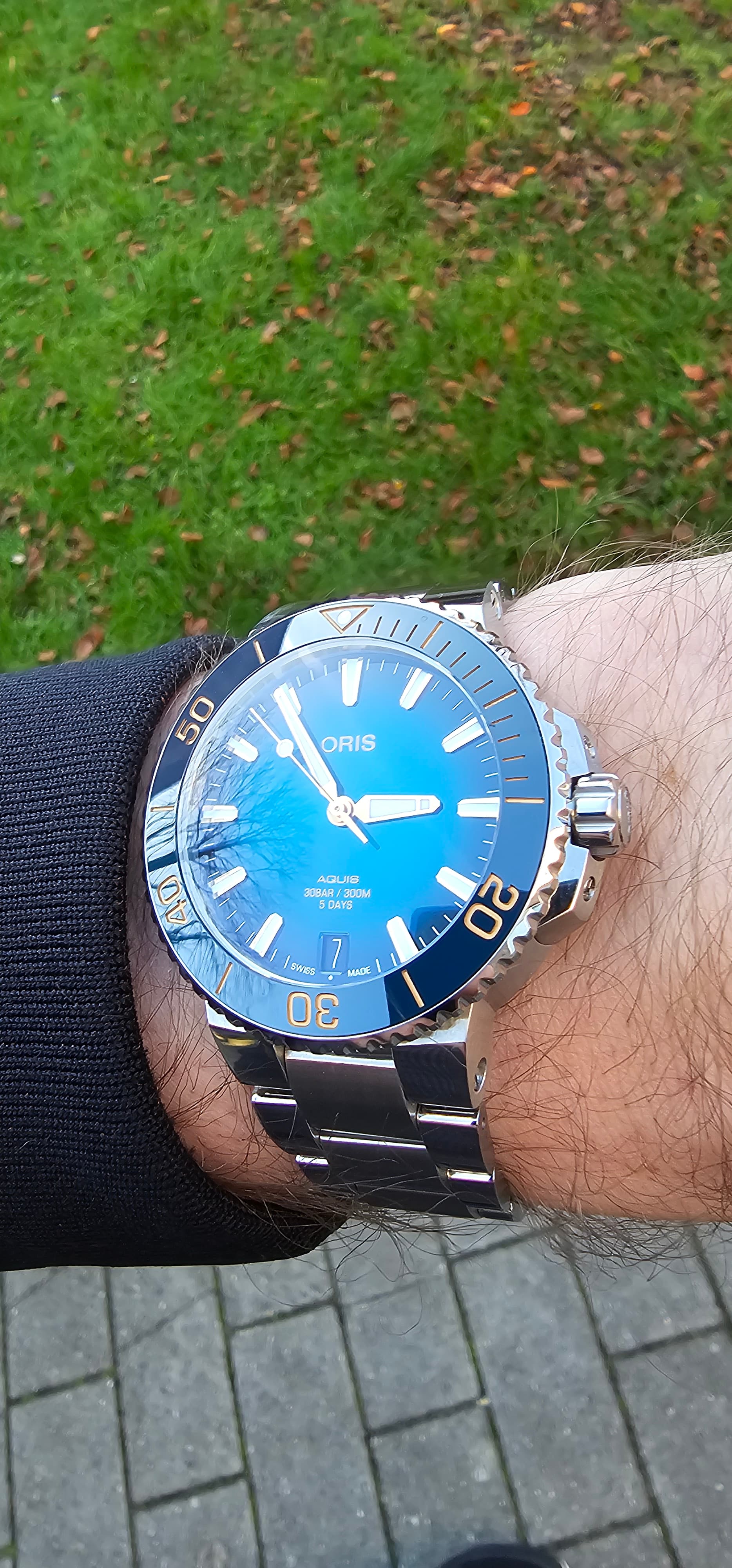 Gekocht voor mijn lief, want die heeft het nu al een half jaar over dat ze ook wel eens een mooi horloge zou willen. Nonchalant vroeg ik haar “waar denk je dan zoal aan?” en ze kwam iedere keer weer uit op deze blauwe Oris Aquis 36,5mm parelmoer wijzerplaat op rubber om dan te vervolgen “maar ja die €2.150,- is wel serieus geld”. Ze weet nog van niets, maar die is inbound en voor onder de kerstboom. Kan niet wachten om haar koppie te zien wanneer ze dit uitpakt. ![]()