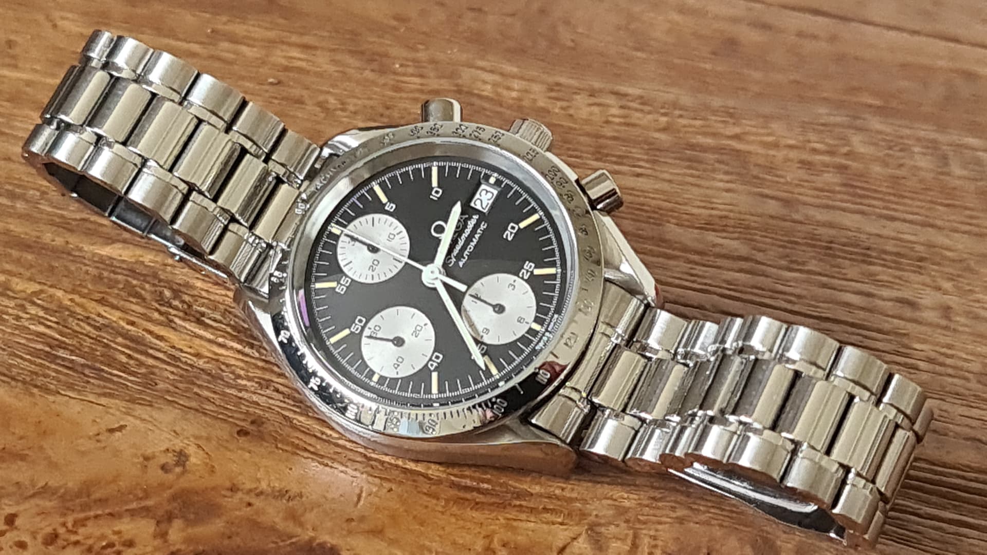 Een Nomos Worldtimer Night Navigation Grid, een Speedmaster Mark II en een zwarte Longines Heritage Chrono. De laatste wel vanwege een iets te pusherige Italiaan op chrono wat ik niet 100% vertrouw.