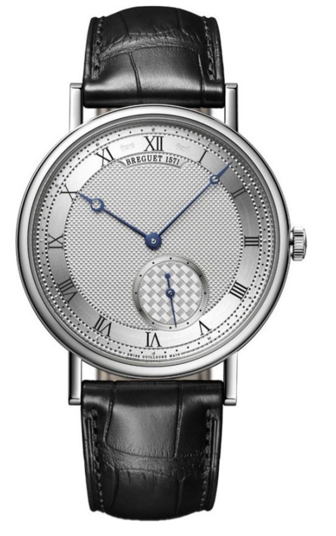 wat een scheef ding: die kleine seconde die ergens neergekwakt lijkt en de plaquette(?) waar Breguet op staat lijkt door de dikte van de Romeinse cijfers van de 11 en 12 tov de 1 ook scheef. (los van de Romeinse cijfers wat ik ook lelijk vind…)