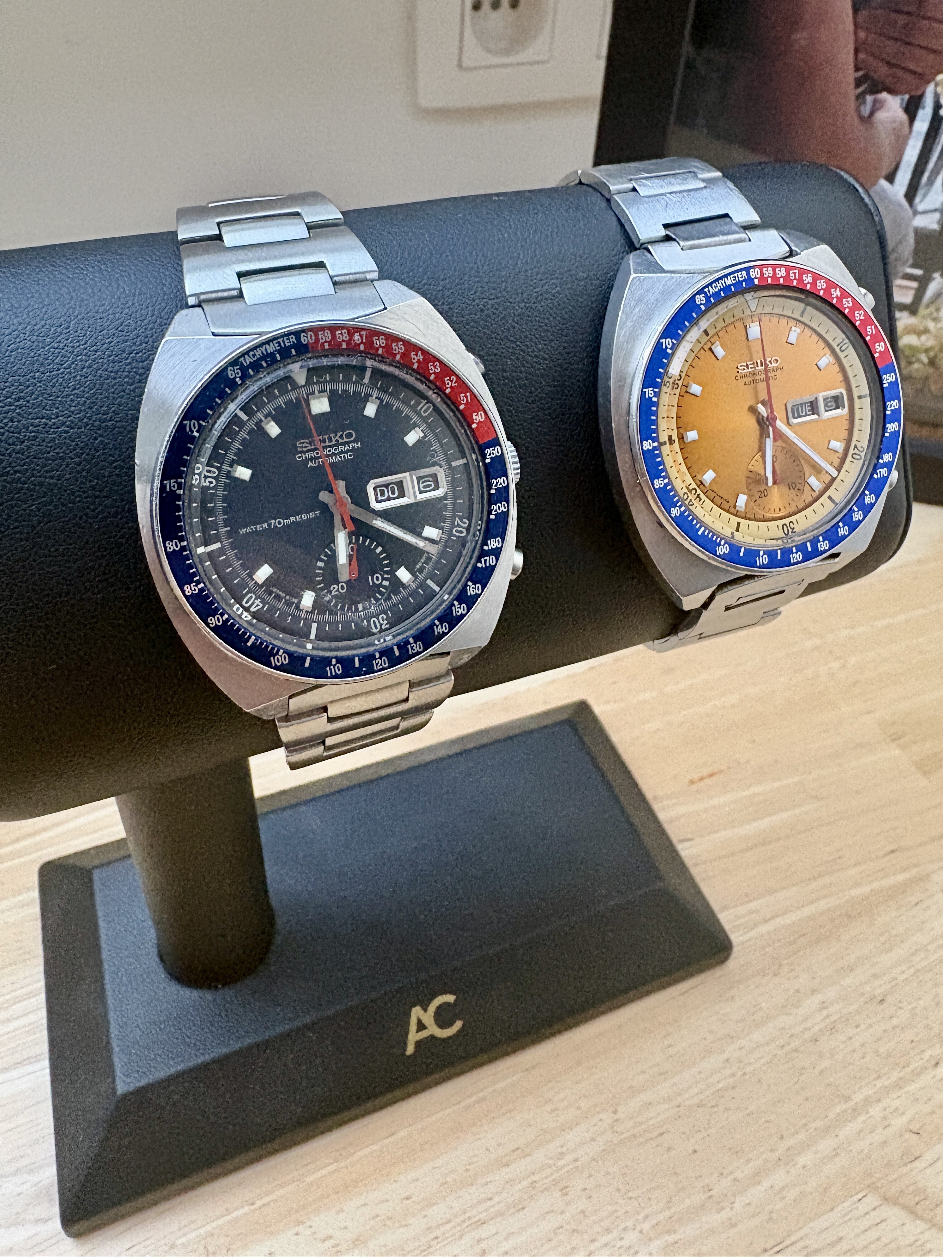 Het bandje op de gele is original, die blauwe niet.
