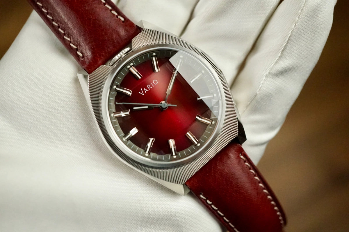 De rode heeft horizontale banen op de wijzerplaat. Of zijn het bakstenen, een ode aan de bouw? ![]()
