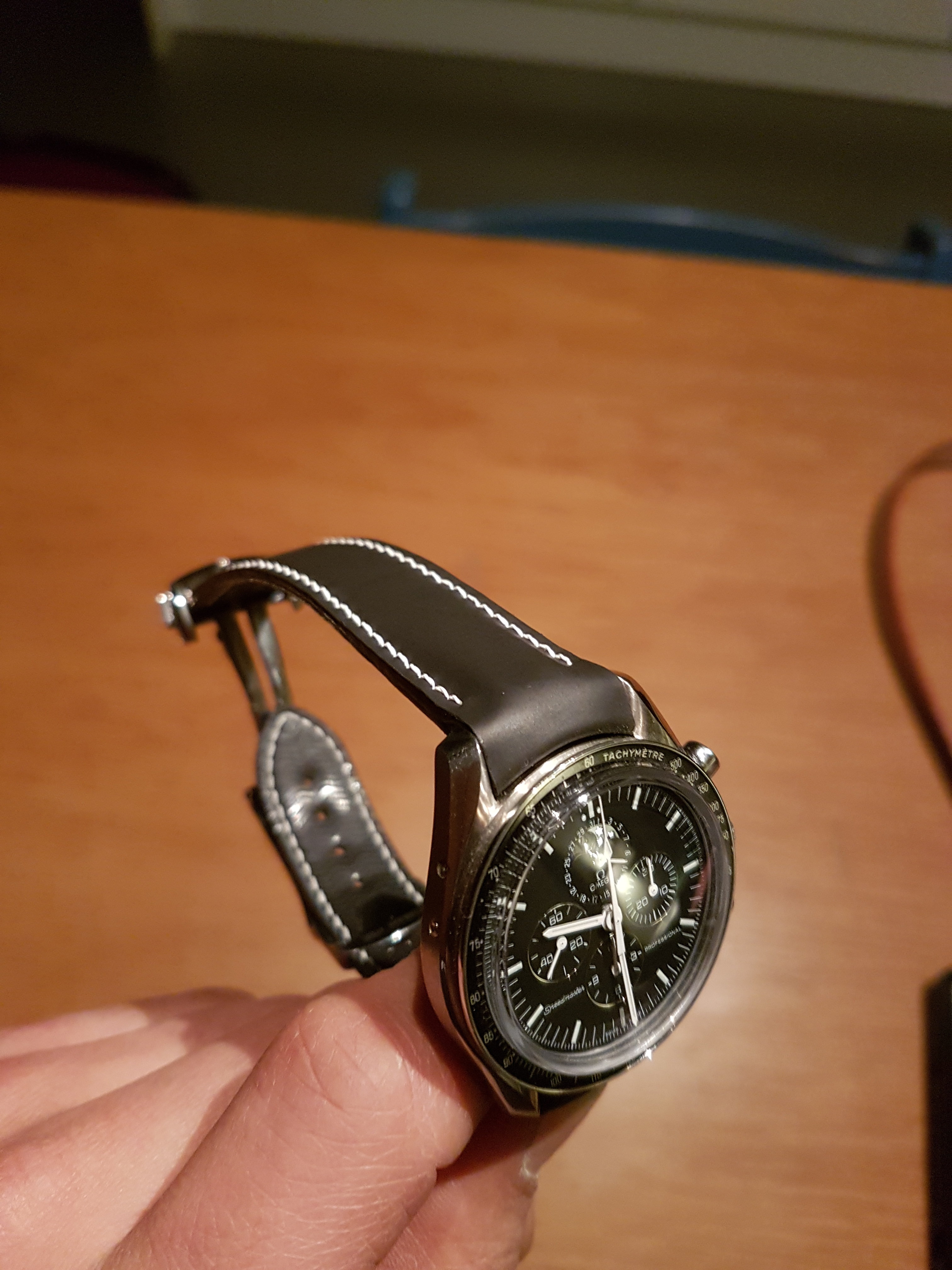 Vanavond eindelijk m’n speedy op het nieuwe bandje! Na hopeloze vertraging bij PostNL, zelfs met een aangetekend pakket, kwam gisteren het pakket aan. De rubberen band met Omega vouwsluiting voor de planet ocean van @Mika overgenomen. Dit geheel op mn speedy gemonteerd. Ik had al plaatjes bekeken op het www en het past. Niet perfect maar prima. Tzt nog een mooie lederen band laten maken voor deze vouwsluiting. Voor nu weer poosje blij!