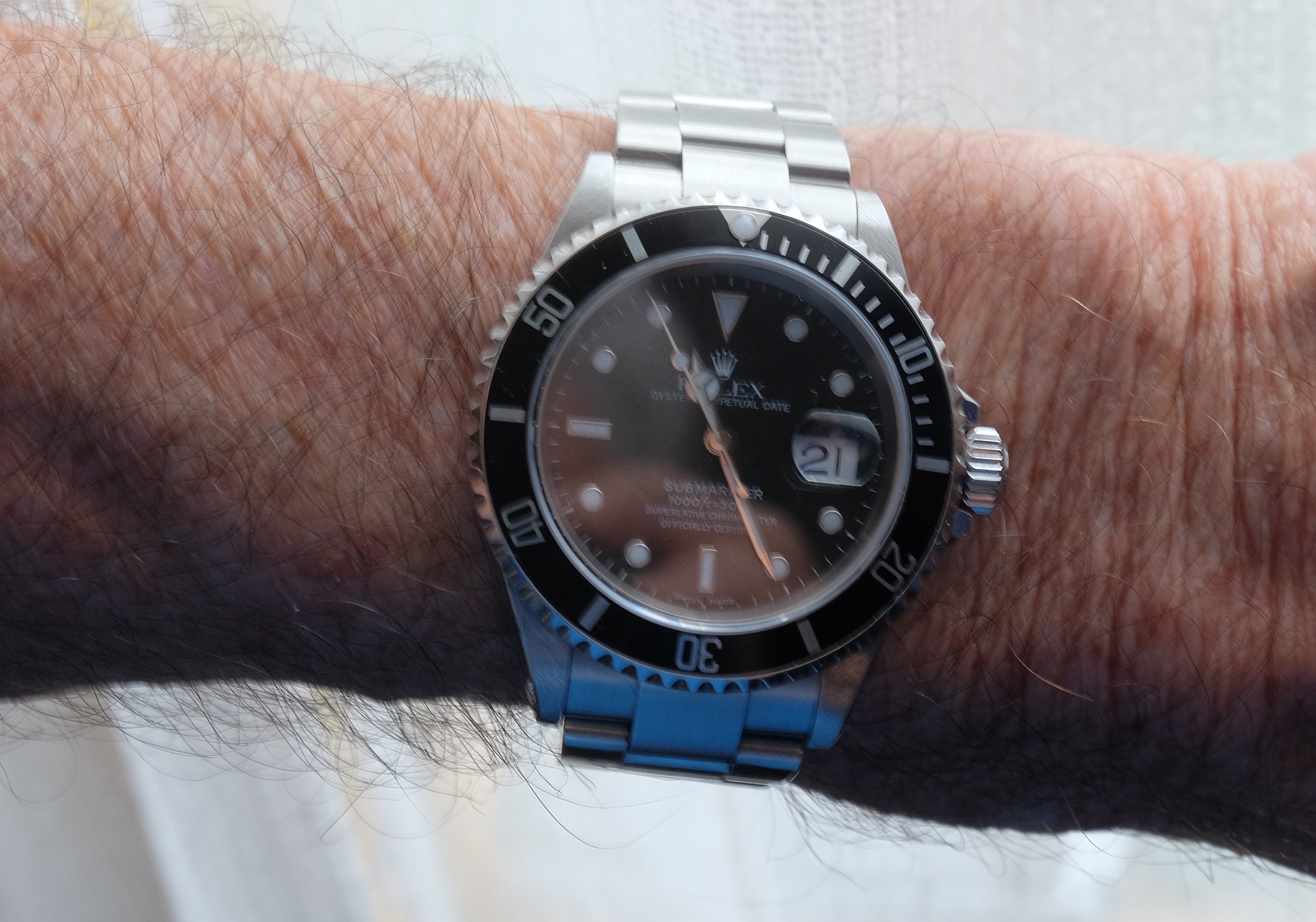 Op een smalle platte pols moet deze Sub net kunnen, ook al is de plaats van de grote clasp verkeerd. Deze is gisteren NA en wordt op deze zondag voor het eerst gedragen!