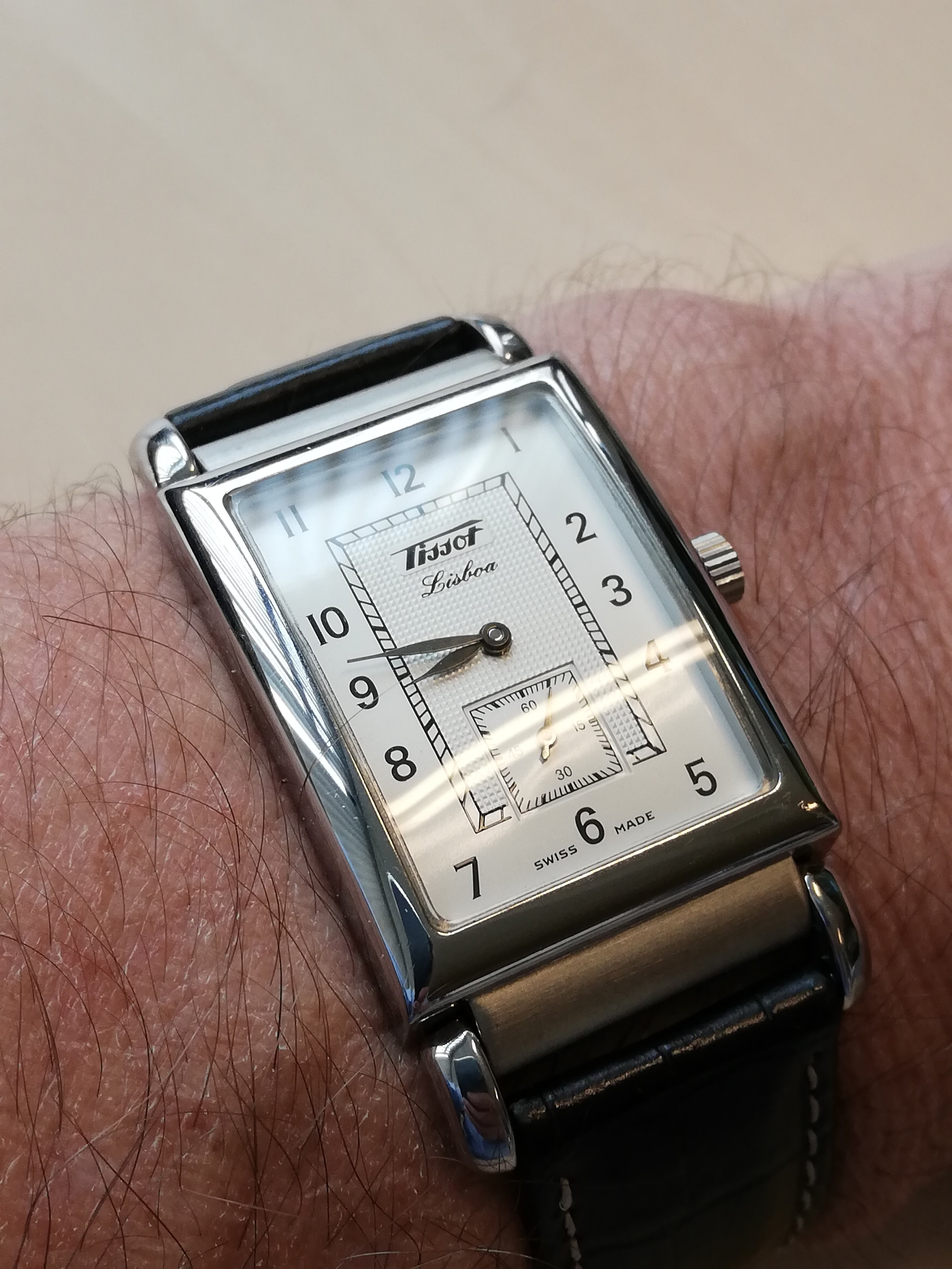 Rechthoekige horloges dragen naar mijn ervaring altijd groter dan je op basis van afmetingen zou verwachten. Hier een 23x36mm (inclusief lugs) Tissot op mijn net geen 16cm pols.
