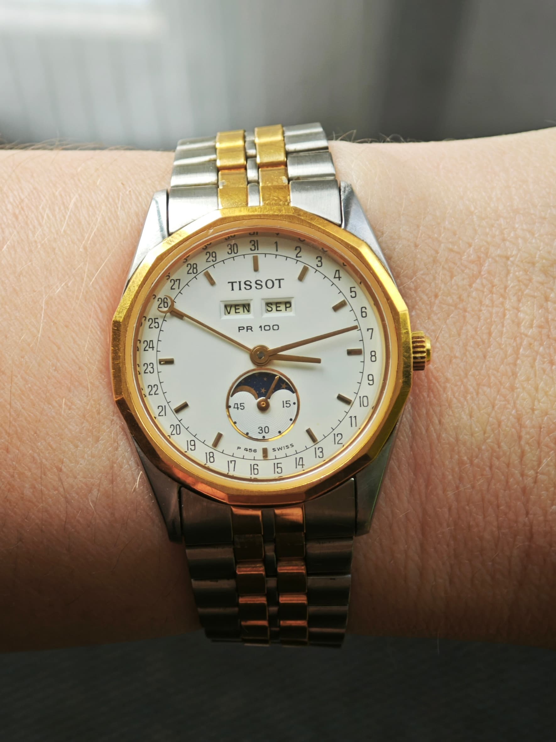 Wilde al een tijdje een moonphase, gewoon om eens te proberen. Dus eea aangeschaft via de veiling in Japan. Het pronkstuk kwam binnen maar was helaas een heel stuk kleiner dan gedacht. Dus ook die siert nu de pols van de wederhelft.