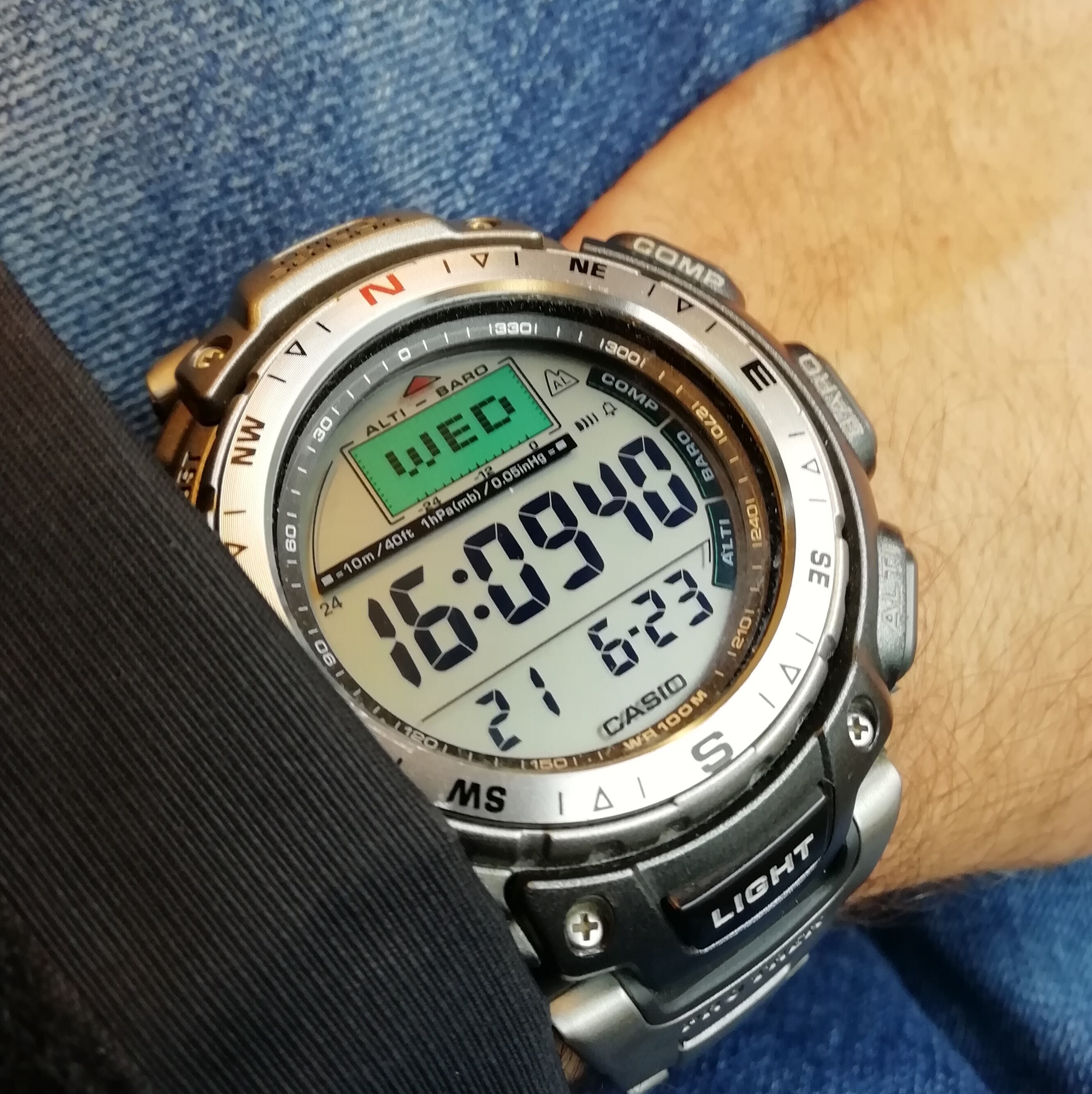 Collega (IT-afdeling) op het werk tijdje terug die le aansprak op m’n horloge. Droeg toen de Casio Pro Trek PRG-40 Titanium. Leuke babbel gehad en dat ik er wel enkele liggen had, vraagt me nu regelmatig wat ik om de pols heb.