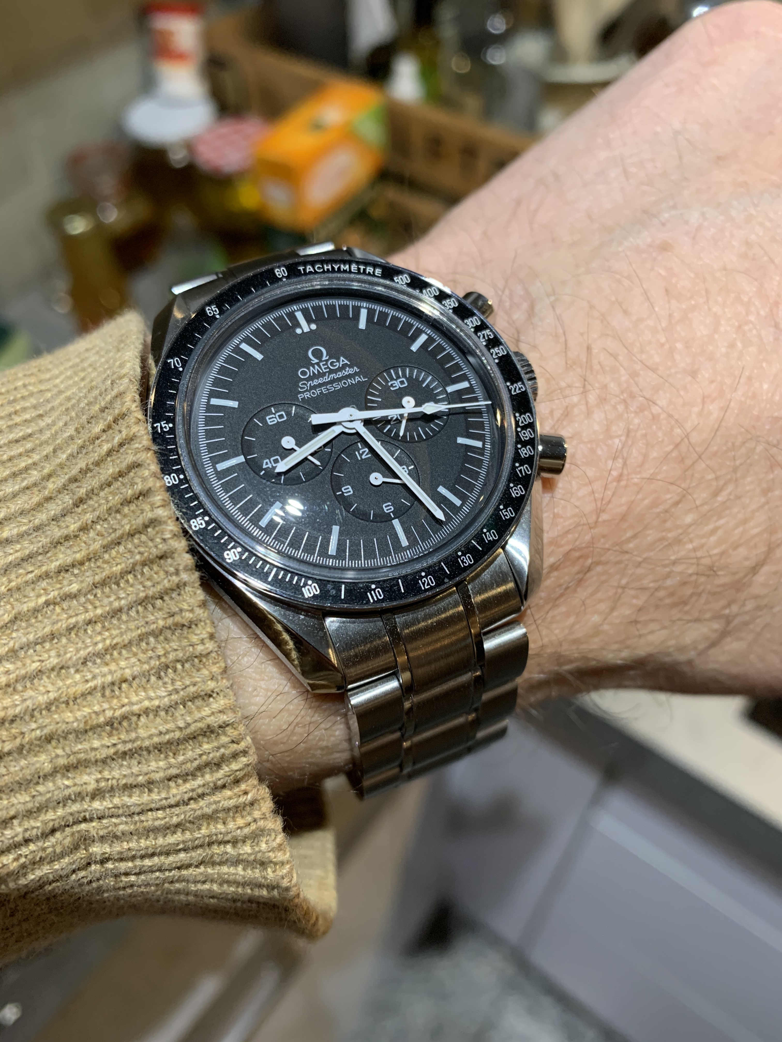 Het opvallende is eigenlijk wel dat ik de Speedmaster voorheen maar een saai horloge vond. Je ziet ze hier op het forum zo veel voorbij komen dat het speciale er vanaf gaat en je op een gegeven moment niet meer ziet hoe mooi die eigenlijk is: een mooie chrono met een prima formaat. Een ‘all black’ met witte elementen. De 3 zwarte subdials in de zwarte wijzerplaat is natuurlijk een prachtig element. En verder is het horloge gewoon heel mooi in balans. Nou ja, jullie zien ‘m hier zo vaak voorbij komen dat jullie wel weten wat ik bedoel…