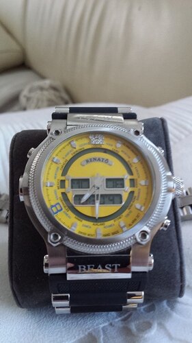 Draag hem eigenlijk nog zelden. Was een favoriet van mij deze Renato Beast Digi / Ana Limited edt. Wellicht gaat deze de verkoop in. Wel met pijn in het hart, maar ongedragen laten liggen is ook zonde. Ga er nog een nachtje over slapen.