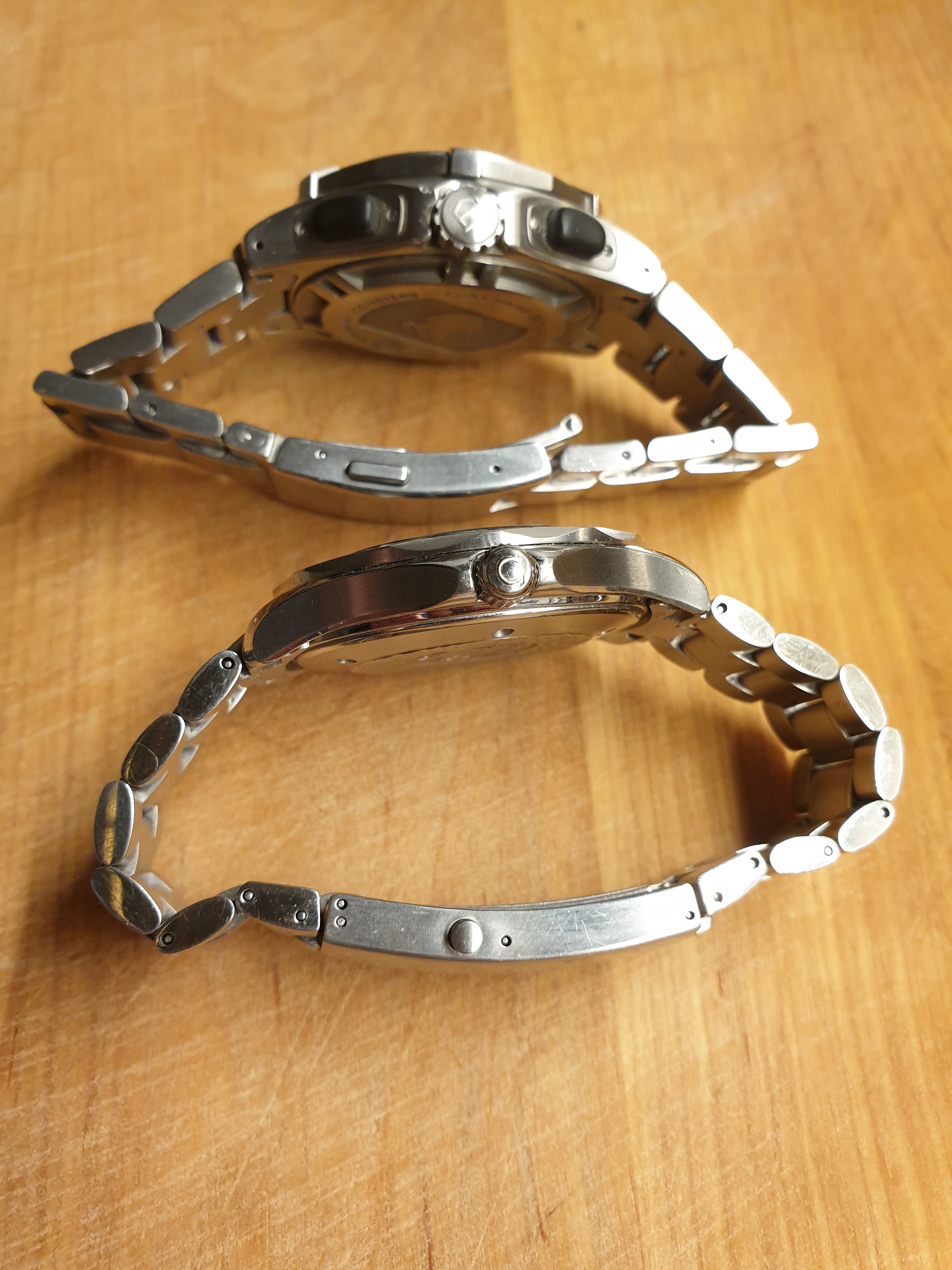300m tegen 500m, chronograaf zonder datum vs alleen datum, wel beiden een heliumventiel. Van boven gezien is het verschil in grootte niet eens zo evident. Van de zijkant echter een stuk duidelijker.