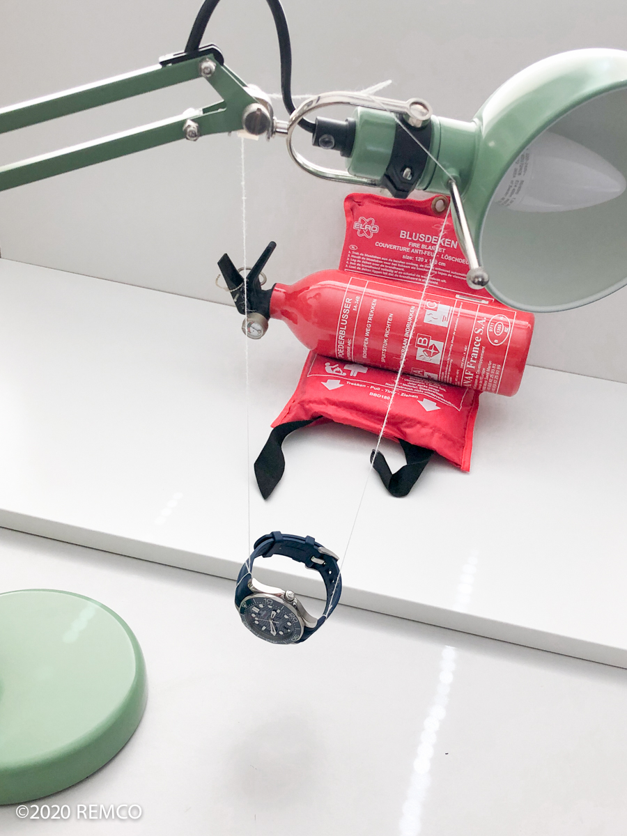 Het horloge gewoon ergens bijleggen was me wat te eenvoudig en dus kwam er deze keer een Ikea ‘schaarlamp’ en een beetje garen aan te pas. Ophangen dat ding, laten zweven. Dat was het doel.