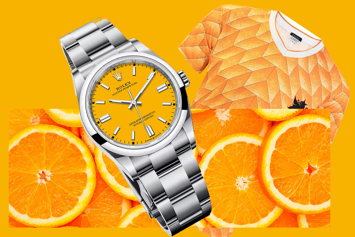 Hippe kleurtjes zijn in horlogeland helemaal hot, dus pak je oranje horloge, plem hem in een doos sinaasappels met je EK shirtje… et voilà: een monochrome foto.