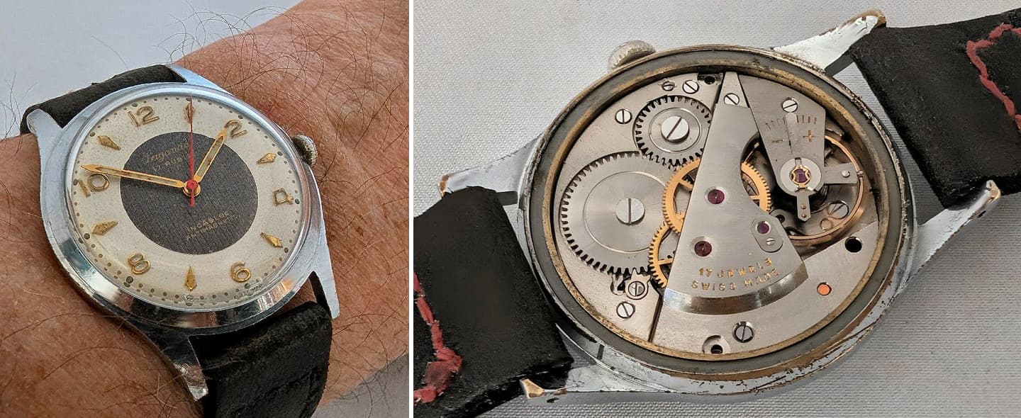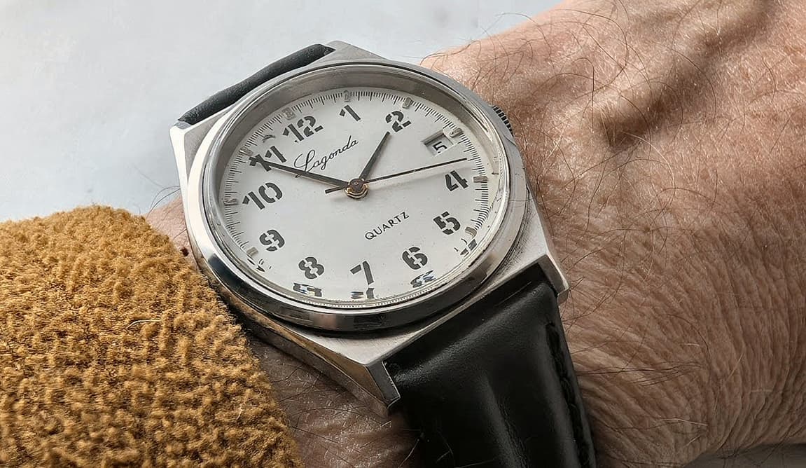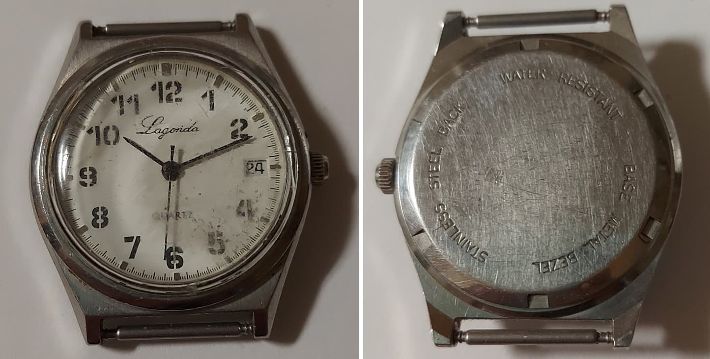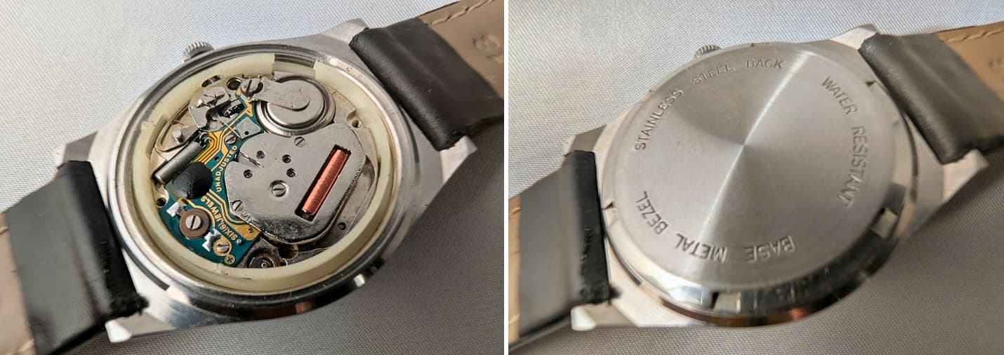 De ‘nieuwe’ quartz Lagonda maakt de lage aanschafprijs waar: Het blijkt een flink gedragen horloge met een stalen kastje in een draagbare maat van 35mm. Rvs ondanks de inscriptie ‘base metal bezel’ op de caseback. Duidelijke gebruikssporen en lekker vies. Een glaasje dat betere tijden heeft gekend maar misschien nog wel valt te polijsten. De wijzerplaat heeft een mooie seconden index en grappige cijfers in een type ‘kist sjabloon’ letters die ik bij een horloge nog niet eerder gezien heb. Uren wijzer, minuten wijzer, seconden wijzer. Datum. Helemaal standaard… Ik ben benieuwd naar het uurwerkje en dat blijkt, net als mijn ooit eerder verworven mechanische Lagonda, eveneens van Zwitsers fabricaat.