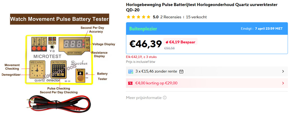 Ik zou ook nog zo’n eenvoudig Quartz testertje bij Ome Ali kunnen bestellen, maar ik vond, vrek als ik ben, bijna 50 euro voor een testapparaat om een horloge van 6 euro door te meten wat te gortig.