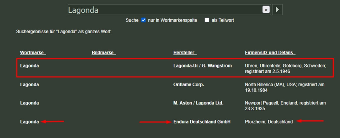 Een Lagonda. In Mikrolisk geregistreerd als submerk van de Duitse horlogefabrikant Endura uit Pforzheim, maar voor zover ik weet vrijwel uitsluitend aan de Zweedse / Scandinavische markt geleverd, wat bevestigd wordt door de aparte merkregistratie voor de Zweedse firma Wangström uit Göteborg.