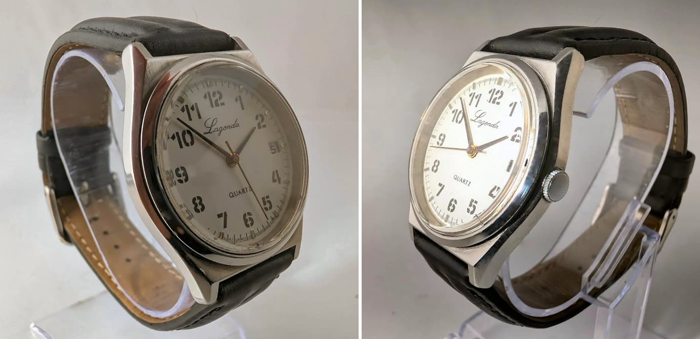 Maar soms lukt het wel. Mooi voorbeeld is deze recent verworven op Tradera aangeboden Lagonda. Weliswaar een quartz horloge, maar vermoedelijk een met een wat ouder quartz model uurwerk uit de begintijd, zeg eens jaren 80. In dit geval een horloge met een leuk ontworpen wijzerplaat met een apart cijferfont. Startprijs: SEK 9. Ik hou voor het gemak altijd maar een koers aan van Euro naar Zweedse Kronen = 1:10, dus zeg maar: 9 dubbeltjes!