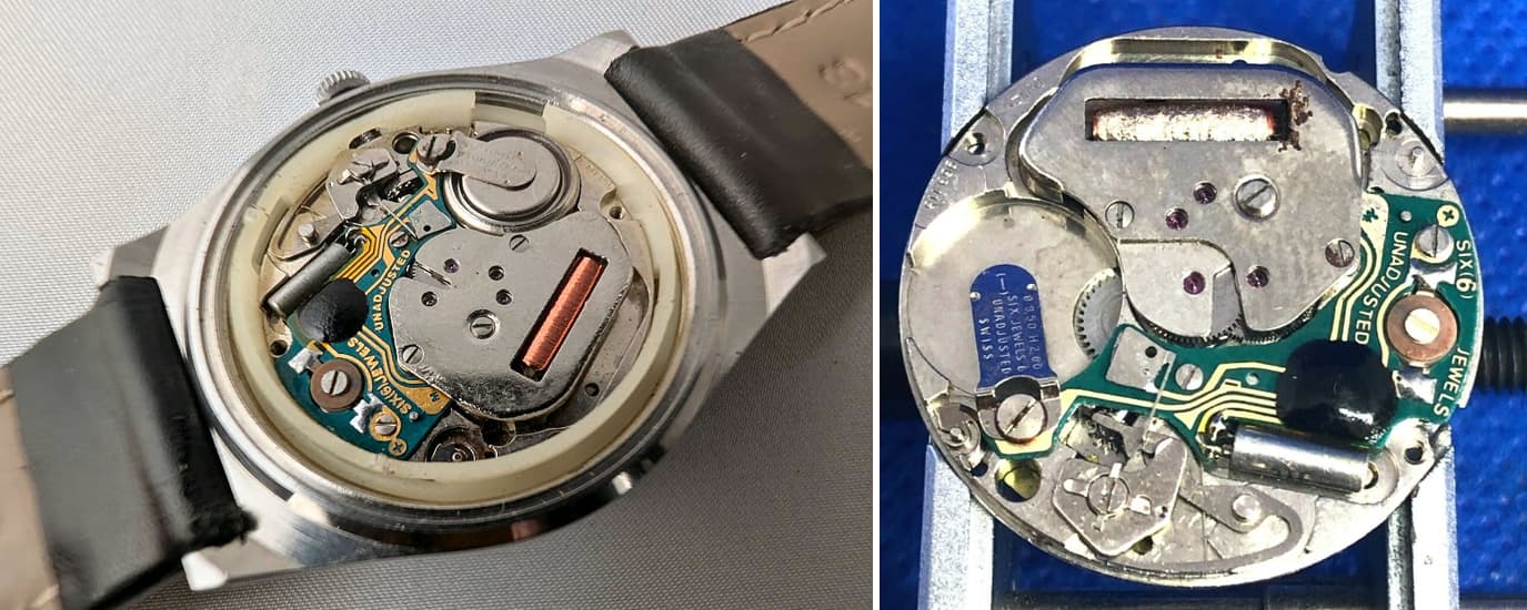 Het bleek een ETA-ESA 963.115, het kaliber nummer was volgens goede Zwitserse traditie netjes in de platine gestanst. Helaas is het een van de minder voorkomende productie series uit de zeer grote ETA ESA 95X/96X familie en is er niet veel documentatie over terug te vinden. Het kalibernummer komt ook niet voor in de lijst van ESA quartz uurwerken in de Ranfft database.