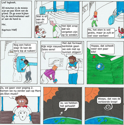 Aflevering 3, veel actualiteit erin verwerkt en de eerste poging tot opstijgen. Hier ben ik voor het eerst begonnen met ‘brush pens’. De kleuren worden er een stuk helderder van als met kleurpotlood. Dieren worden vooral ingeladen om bandjes te kunnen maken.